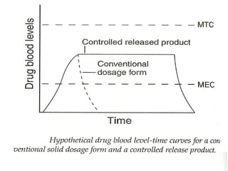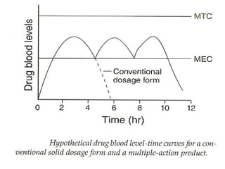 This document discusses modified-release oral dosage forms, including extended-release and delayed-release forms. It describes various technologies used to modify drug release rates, such as coatings, matrices, and osmotic pumps. It also covers terminology, drug candidates suited for modified dosing, clinical considerations, and FDA/USP regulations regarding testing, labeling and in vitro-in vivo correlations. The goal of these dosage forms is to reduce dosing frequency while maintaining therapeutic drug levels over time.