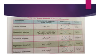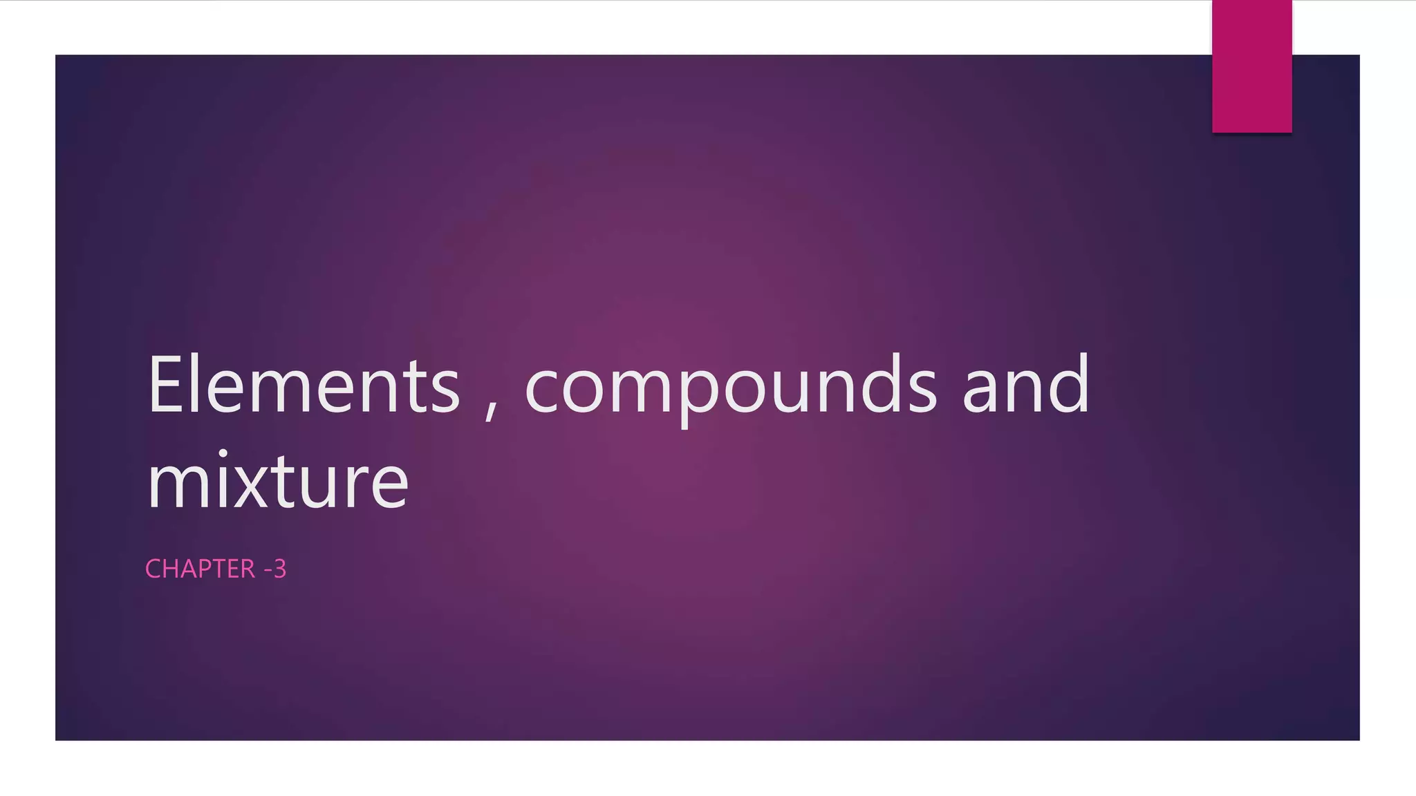 This document discusses elements, compounds, and mixtures. It defines elements as pure substances made of only one type of atom that cannot be separated into simpler substances. Compounds are made of two or more elements chemically bonded together in fixed ratios. Mixtures contain two or more substances mixed but not chemically combined. The document classifies elements and provides examples, discusses properties of compounds and how to write chemical formulas, and describes different types of mixtures and methods to separate them.