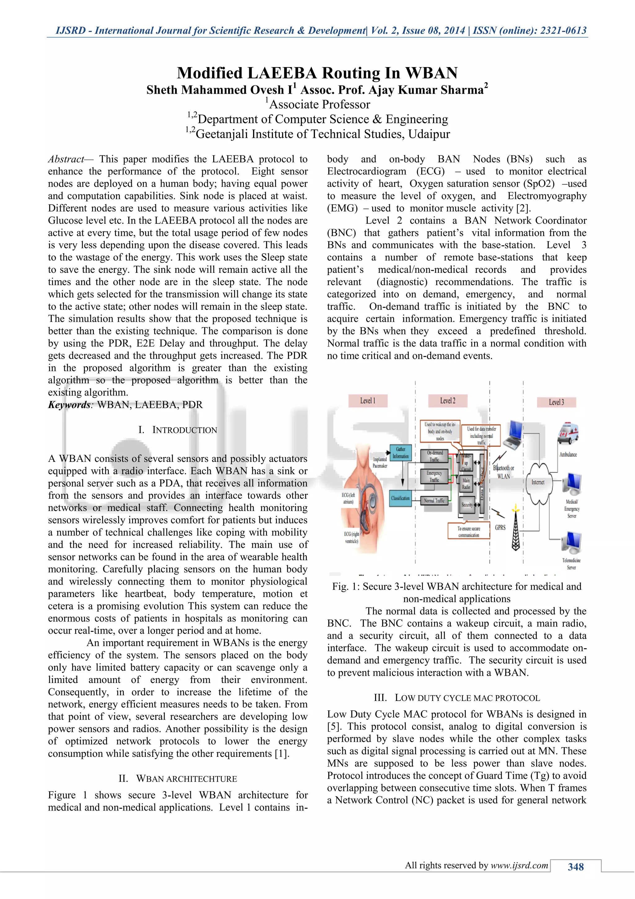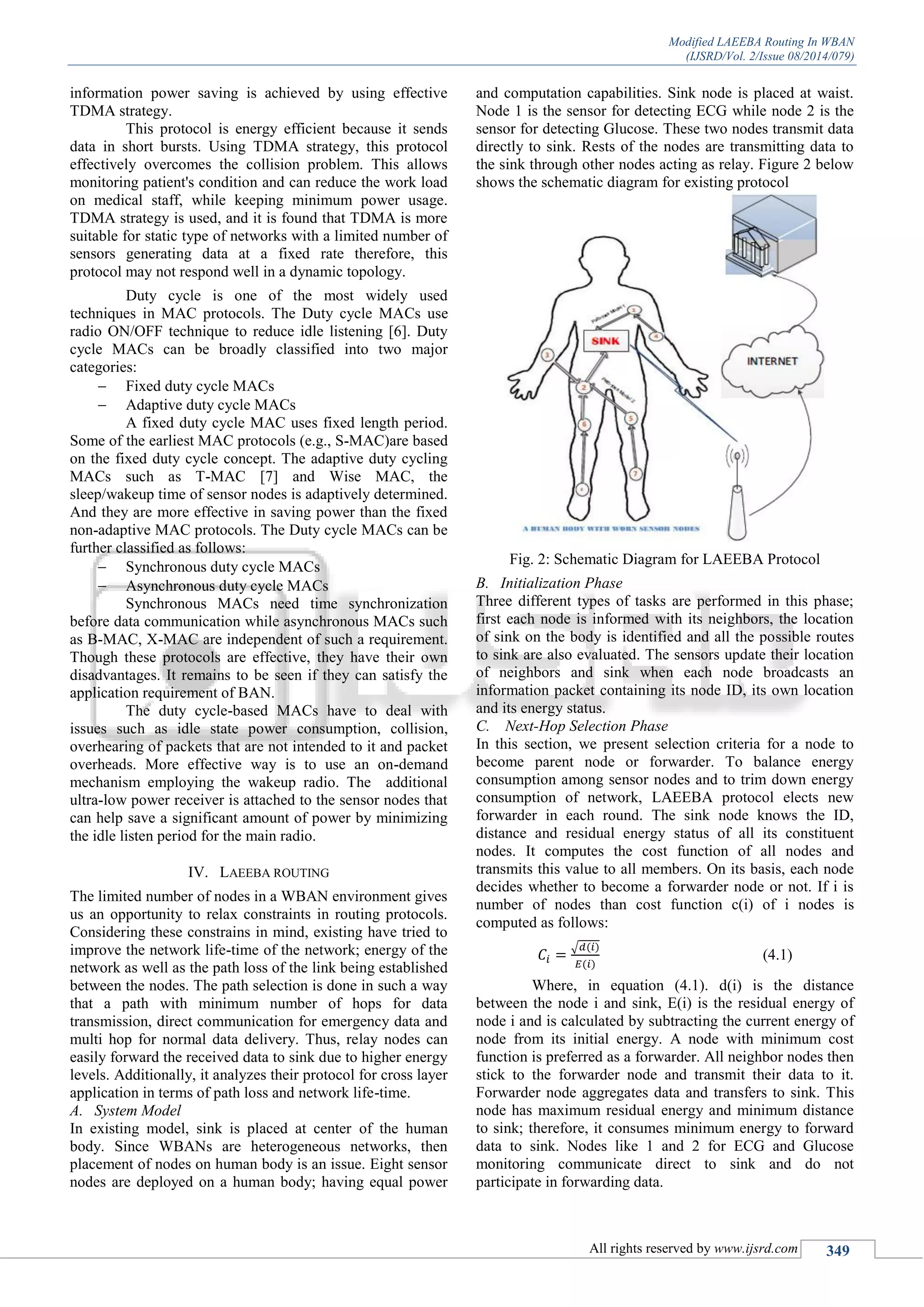 This document presents a modified Laeeba routing protocol designed to enhance the performance and energy efficiency of Wireless Body Area Networks (WBANs) by reducing the energy wastage during sensor node operation. By implementing a sleep state for inactive nodes and activating only the selected nodes for data transmission, the proposed technique demonstrates improved packet delivery rate, reduced end-to-end delay, and increased throughput compared to the existing protocol. The findings are validated through simulations, indicating the effectiveness of the modifications in optimizing the network's performance.