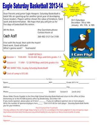 This document provides information about a Saturday basketball camp for youth. The camp will take place over 5 Saturdays in December and January and will have two sessions, one for grades 1-3 and another for grades 4-6. Players will learn values like kindness, hard work, and teamwork. Every camper will receive a basketball. The cost is $15 and registration forms are due by December 4th. Parents must provide consent for any necessary medical treatment.