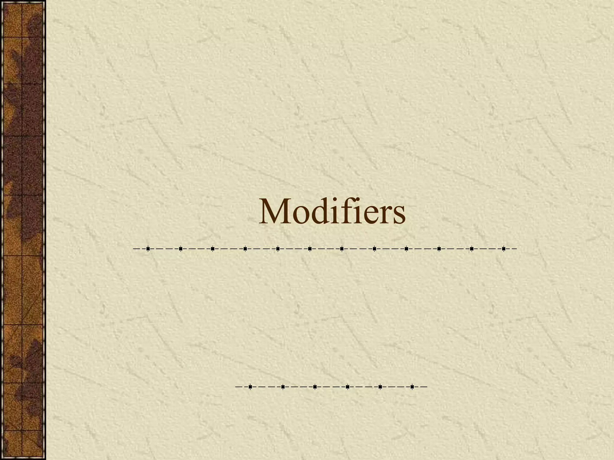 The document discusses modifiers and how to use them correctly to avoid unclear meanings. It defines modifiers as words, phrases, or clauses that provide description. It explains that misplaced or dangling modifiers can lead to illogical meanings if not placed close to the words they intend to describe. The document provides examples of different types of modifiers and guidelines for ensuring they are placed properly to accurately convey intended meanings in sentences.
