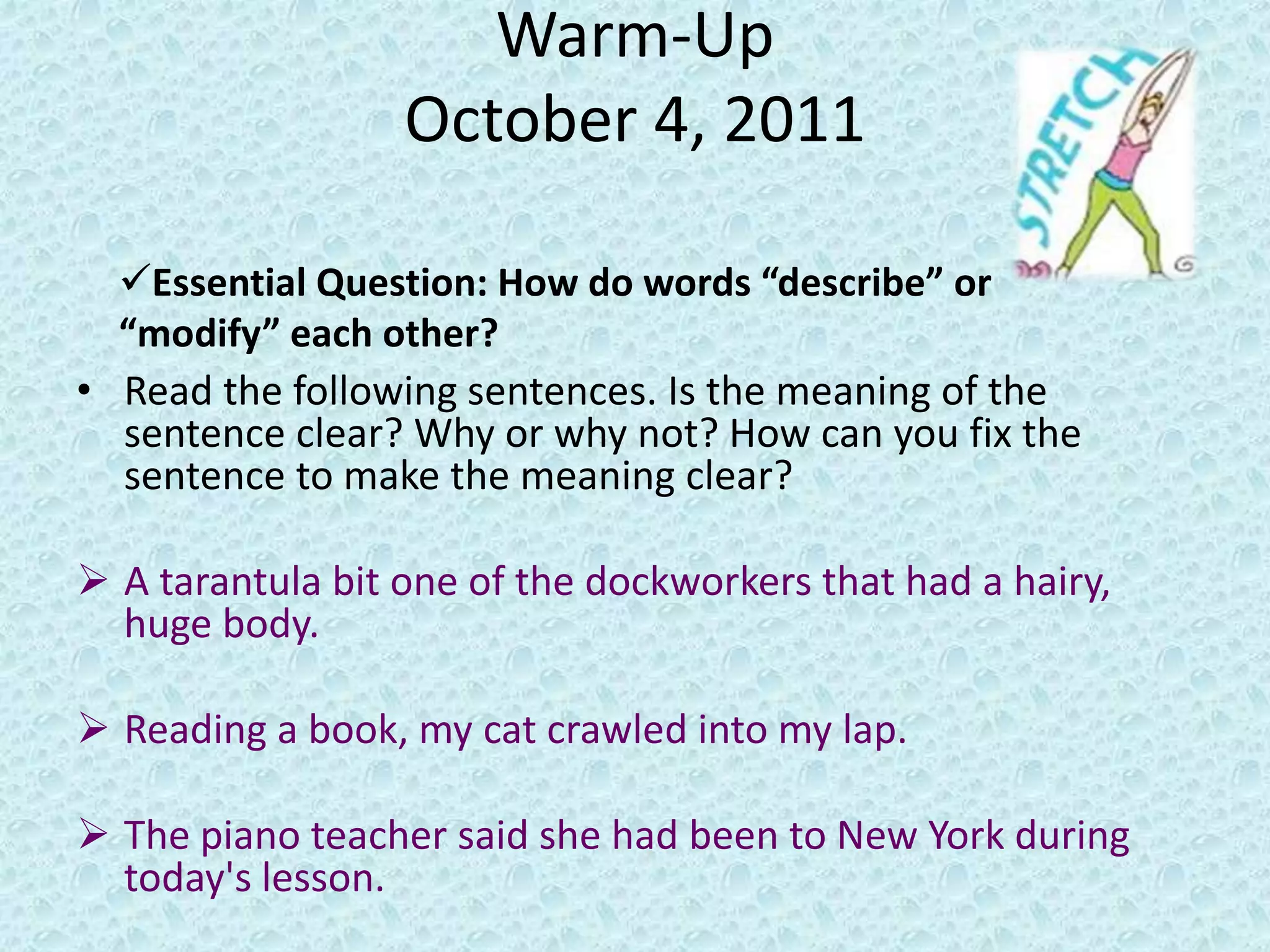 The document discusses modifiers and how they can be misplaced or dangling, leading to unclear or unintended meanings. It provides examples of misplaced and dangling modifiers and explains how to identify and correct them by placing the modifier as close as possible to what it describes. The document also notes that some modifiers like "almost" and "nearly" can change the meaning depending on their placement in the sentence.