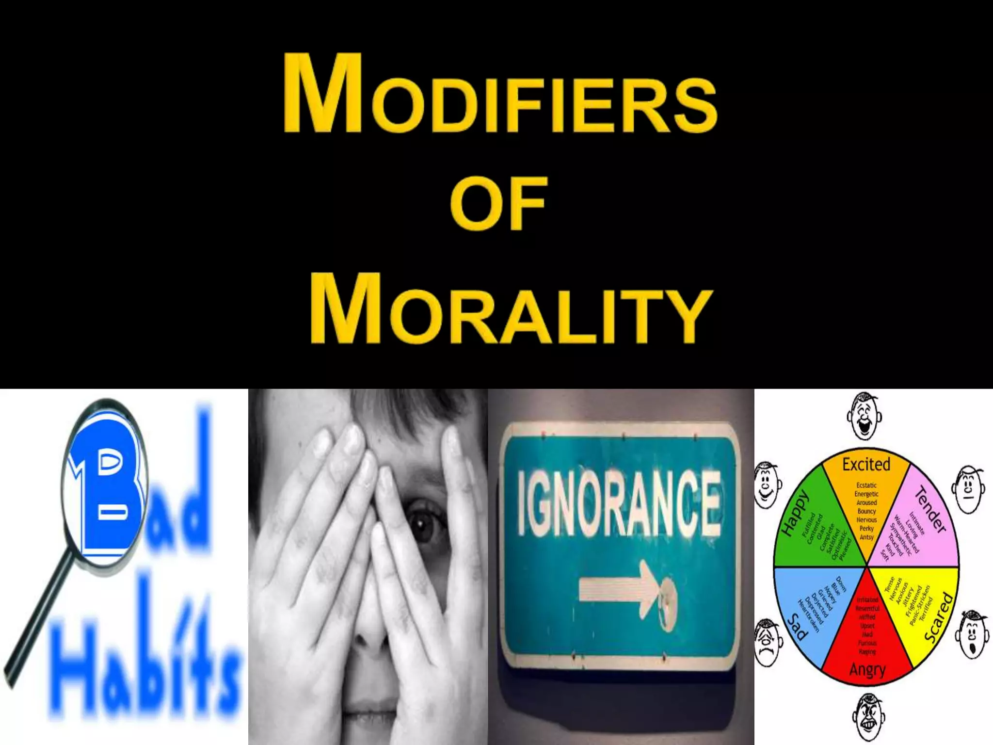 This document discusses factors that can affect an agent's responsibility when performing an act, including fear, ignorance, habit, violence, and passions. It defines ignorance as a lack of knowledge and identifies three types: invincible ignorance which cannot be overcome without extraordinary effort; vincible ignorance which can be overcome through ordinary effort; and affected ignorance where one intends to remain ignorant to avoid sanction. Habit is described as the disposition of mind and body from repeating an act, which can be formed with or without knowledge of immorality.