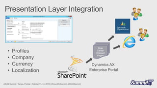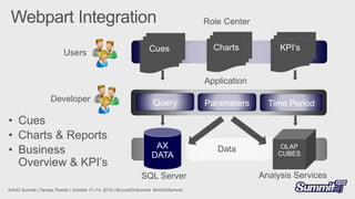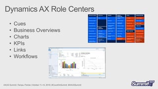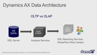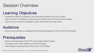 This document discusses Microsoft Dynamics AX 2012 +R2 +R3 and Demand Planner. It mentions several modules including Accounts Payable, Accounts Receivable, Budget control, Inventory value, Retail, Human Resources, Payroll, Demand Forecast, and Forecast Accuracy. It also discusses perspectives, dimensions, measures, and using OLAP tools to create and test MDX Calculated Measures, Members, and Sets. Finally, it mentions connecting Power BI to OLAP Cubes and downloading reports from PowerBI.com.