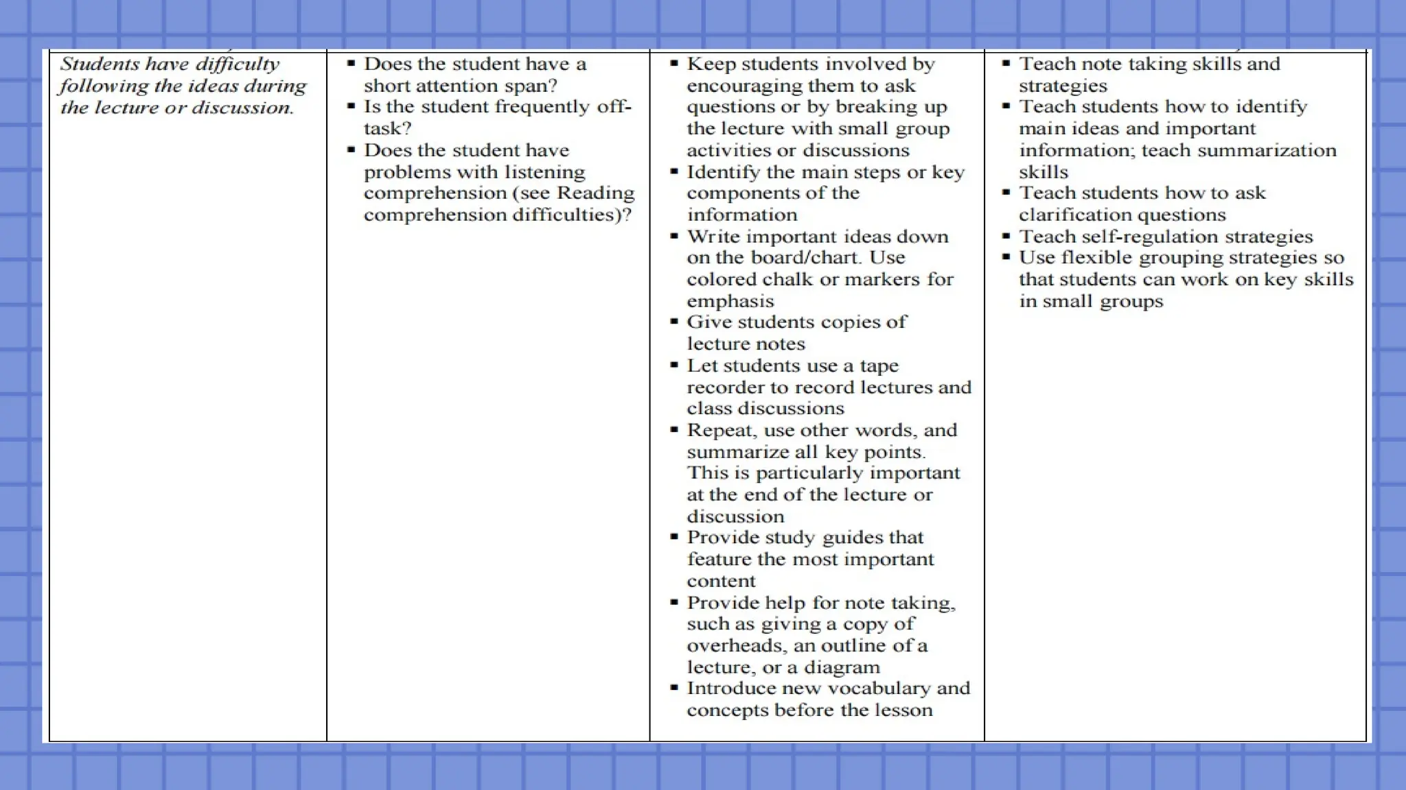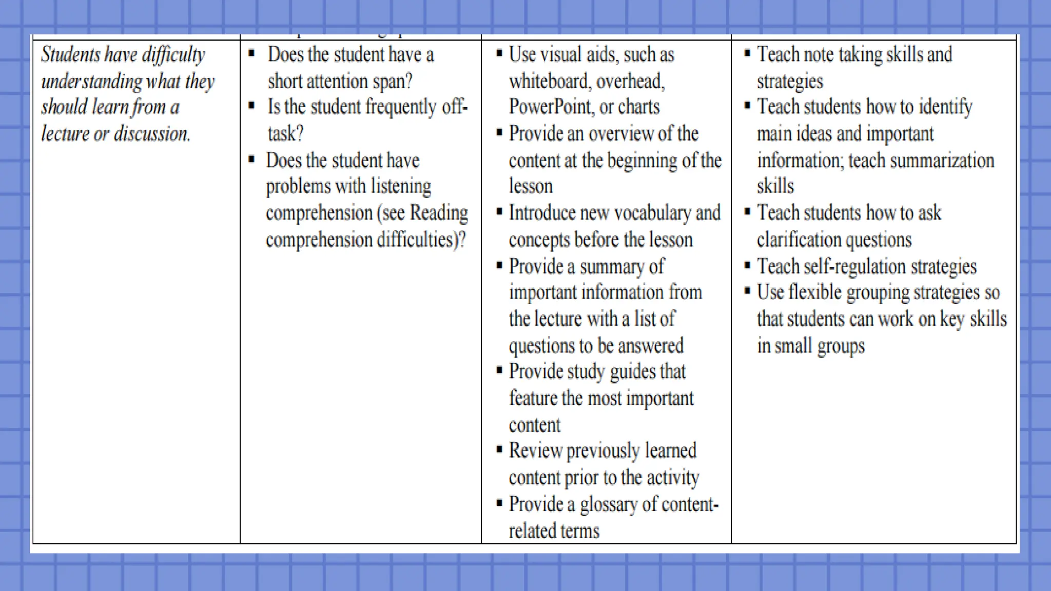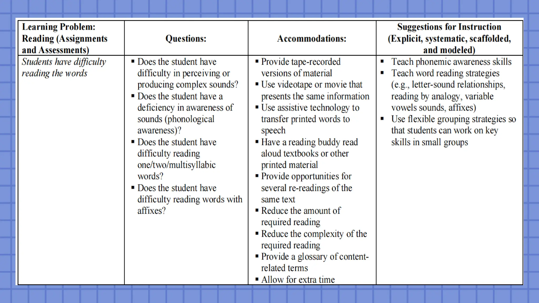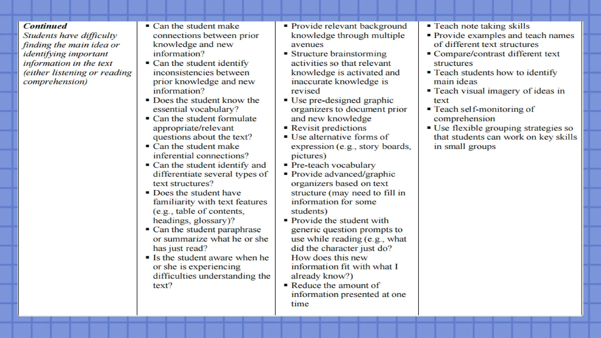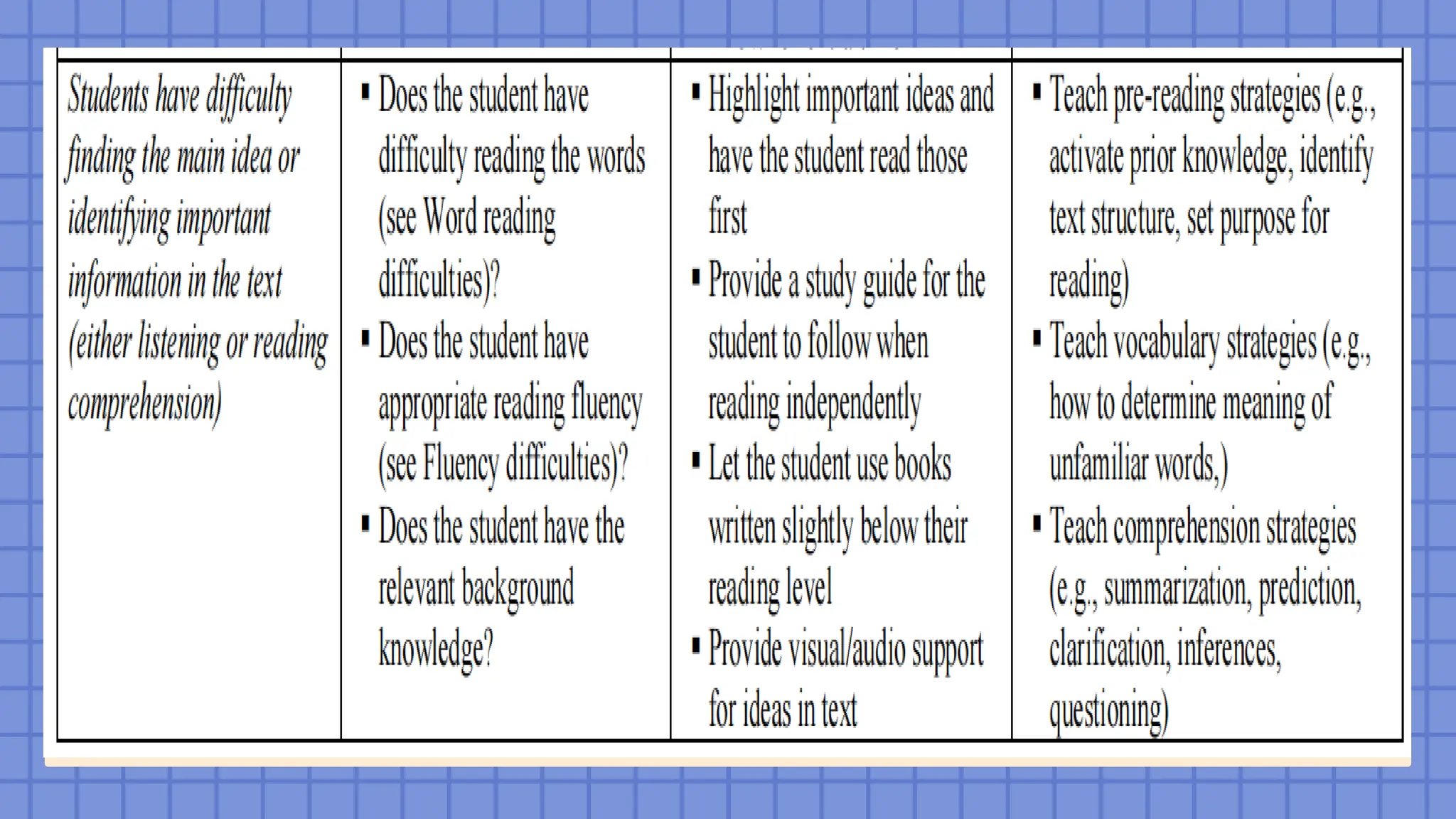 includes consideration of (a) basic and strategic skills instruction and