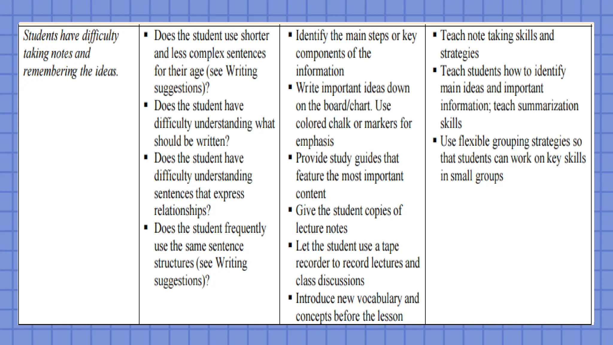 material independently, e.g., prepare a study guide and audiotape.