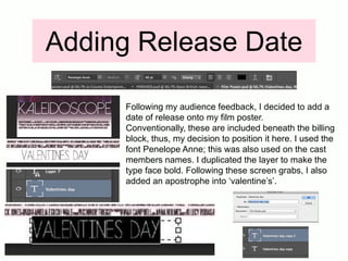 The document describes changes made to a film poster based on feedback. It summarizes adding the release date below the billing block in the same font used for cast names. It then discusses changing the quote to "a heartwarming tale of young love" to better represent the coming-of-age romance genre. Finally, it notes the decision to include social media links like Facebook and Twitter to generate hype and appeal to young audiences connected online.