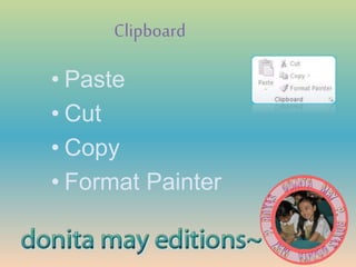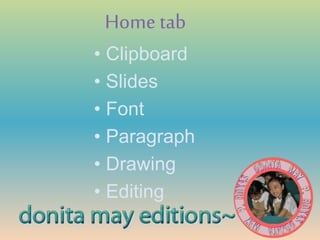This document outlines the various tabs and options available in a slide presentation software. The Home tab contains options for formatting text like font style, size, and color as well as inserting slides, images, tables, and other media. Other tabs allow controlling transitions between slides, animations, slideshow setup, reviewing comments, and changing the presentation view.