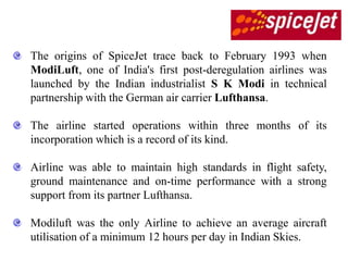 SpiceJet was originally launched in 1993 as ModiLuft, one of India's first private airlines after deregulation. It had technical partnership with Lufthansa and started operations quickly. However, issues arose due to differences between the German and Indian partners, and ModiLuft ceased operations in 1996. In 2004, the airline was acquired and relaunched as SpiceJet under a low-cost model. It has since grown to become India's second largest budget airline.