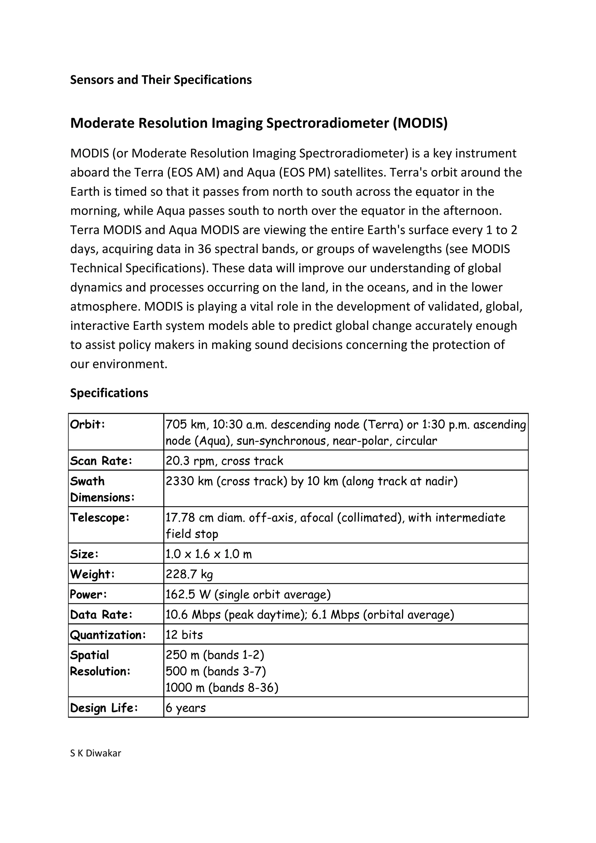 The document summarizes the specifications of the Moderate Resolution Imaging Spectroradiometer (MODIS) instruments aboard NASA's Terra and Aqua satellites. MODIS views the entire Earth every 1-2 days, acquiring data in 36 spectral bands to observe land, oceans, and the lower atmosphere. Key specifications of MODIS include its 705 km sun-synchronous orbit, 2330 km swath width, 36 spectral bands ranging from 0.4 to 14.4 μm, and spatial resolutions ranging from 250 m to 1000 m. MODIS data improves understanding of global climate processes and assists policymakers in environmental decision-making.