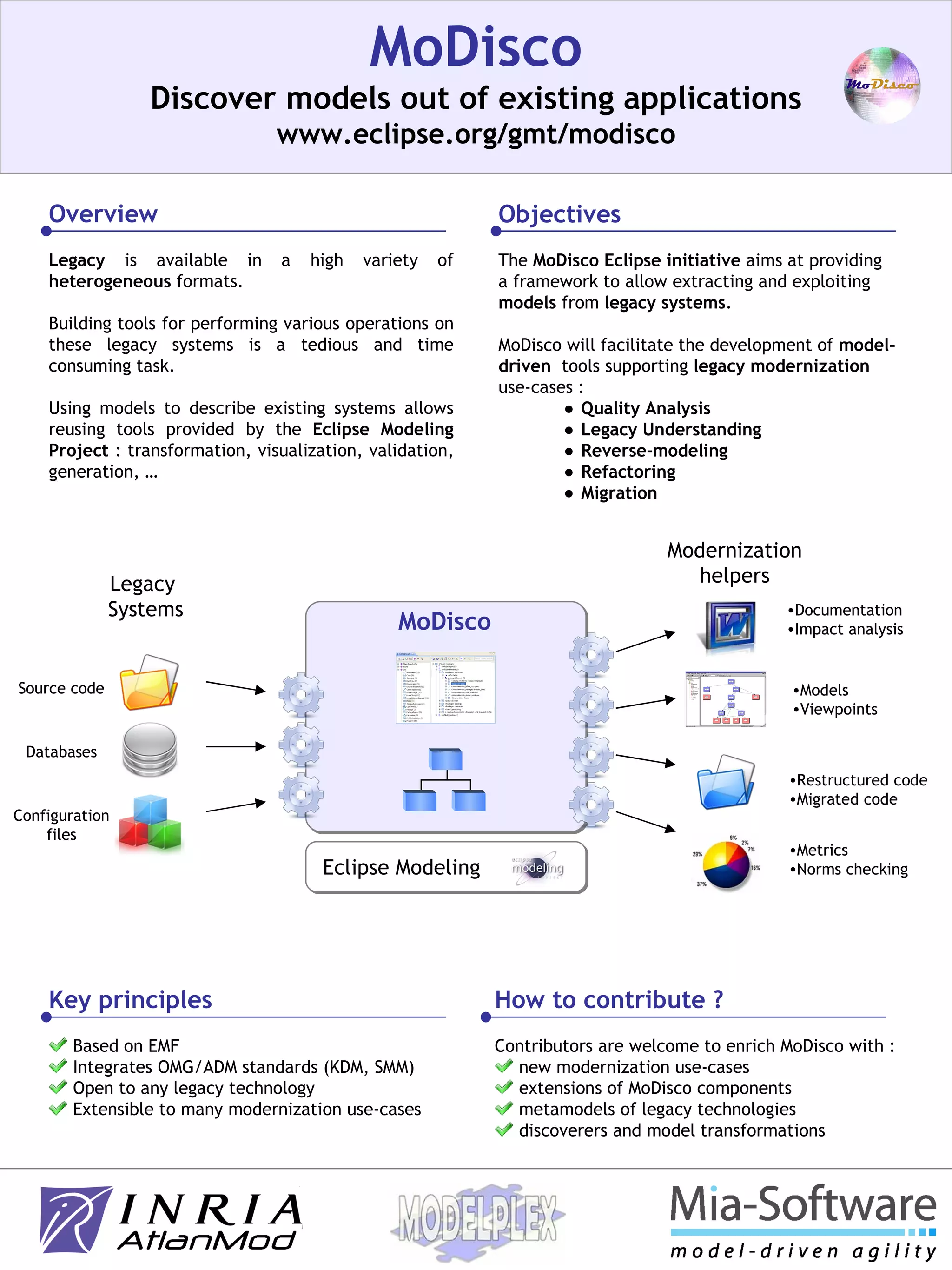 MoDisco is an Eclipse initiative that aims to provide a framework for extracting and exploiting models from legacy systems. It facilitates model-driven modernization tools for tasks like quality analysis, understanding legacy systems, reverse modeling, refactoring, and migration. MoDisco provides technology-specific and standard metamodels as well as discoverers to generate models from legacy artifacts like source code and databases. It has a modular architecture with layers for use cases, technologies, and infrastructure components.