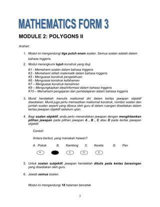 The document is a mathematics examination for Form 3 students in Malaysia on the topic of polygons. It consists of 36 multiple choice questions testing students' understanding of concepts like regular polygons, interior and exterior angles, and finding missing angle measures. It also includes 5 short answer questions requiring students to explain various polygon concepts in writing. The test assesses students on 10 different learning objectives related to comprehending English language questions and mathematical terms, mastering relevant knowledge and skills, and expressing ideas in English.