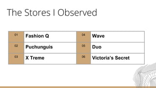 The document provides observations from a retail lab conducted by Nayeli Rodriguez across several stores, including Fashion Q, Puchunguis, X-treme, Wave, Duo, and Victoria's Secret. Key insights include variations in store environment, customer interactions, personnel behavior, and product displays, highlighting differences in branding, organization, and customer demographics. Overall, the analysis reflects on how each store attracts and serves its target market while showcasing distinct atmospheres and experiences.