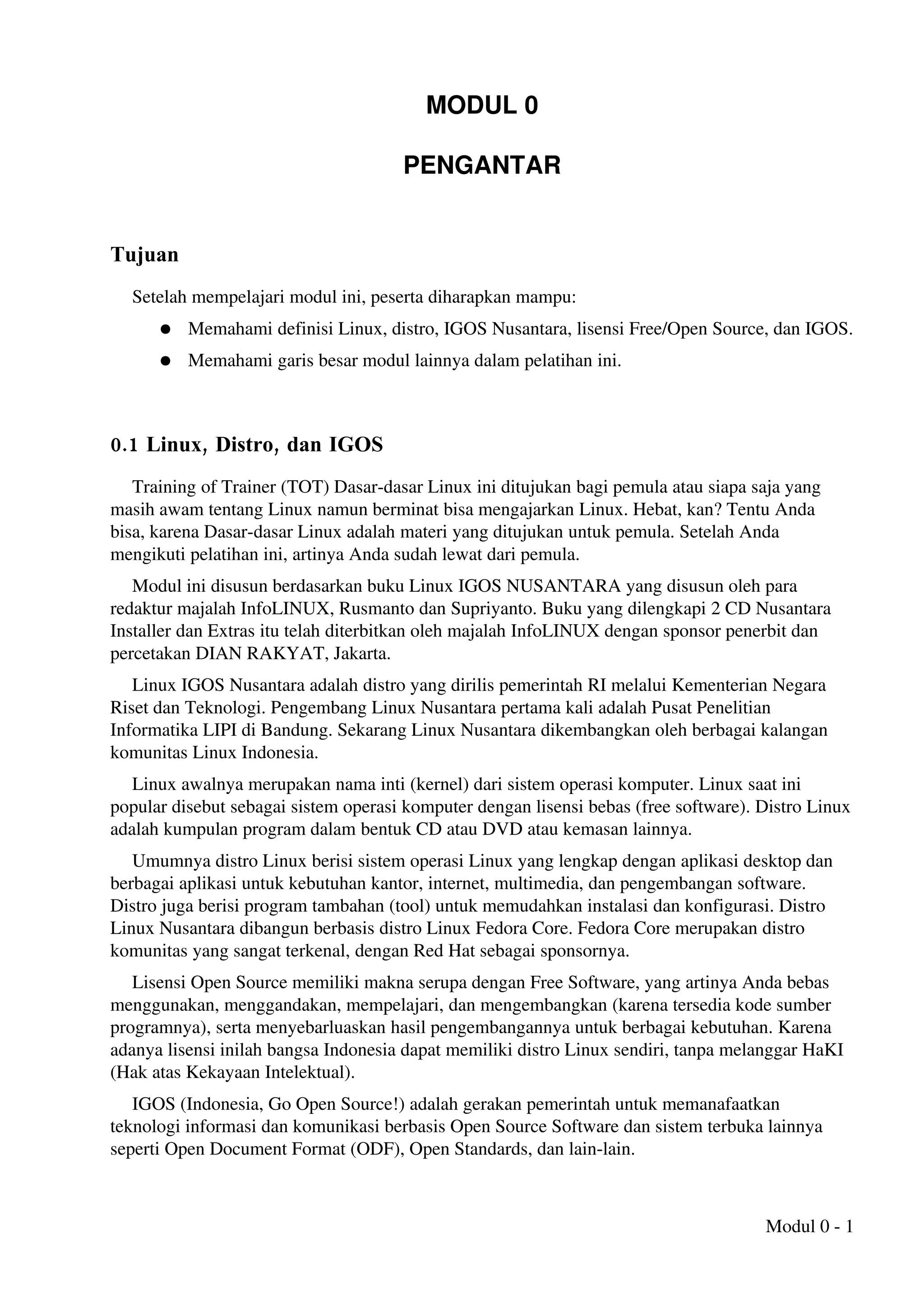 Modul ini diperuntukkan bagi pemula yang ingin memahami dasar-dasar Linux, termasuk definisi distribusi, lisensi, dan gerakan open source di Indonesia. Materi disusun berdasarkan buku Linux IGOS Nusantara dan mencakup berbagai modul pelatihan yang dapat dipelajari secara terpisah dengan fokus pada instalasi, penggunaan, dan pengelolaan sistem operasi Linux. Linux IGOS Nusantara adalah distro yang dikembangkan oleh komunitas Indonesia dengan dukungan dari kementerian dan berlisensi bebas.