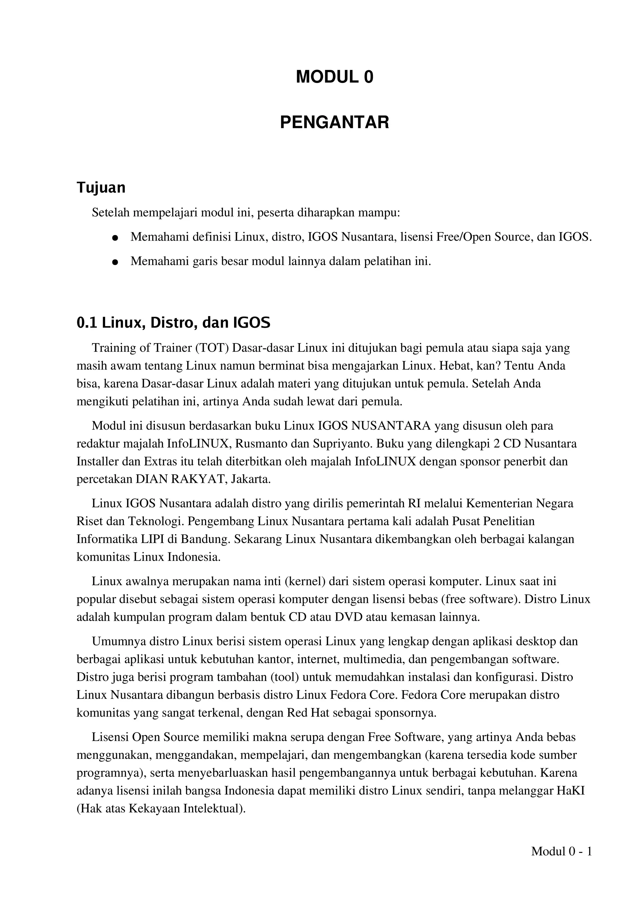 Modul ini bertujuan untuk memperkenalkan dasar-dasar Linux dan distro IGOS Nusantara kepada pemula, mencakup lisensi open source dan kegunaannya. Setelah pelatihan, peserta diharapkan dapat memahami penginstalan dan penggunaan sistem operasi Linux serta modul-modul pelatihan terkait lainnya. IGOS adalah inisiatif pemerintah Indonesia untuk mempromosikan teknologi informasi berbasis open source.