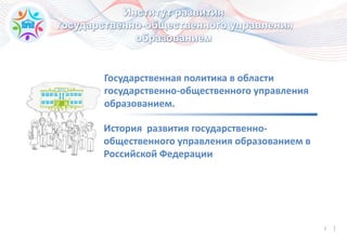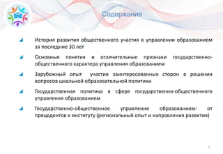 Документ анализирует развитие государственно-общественного управления образованием в России, освещая историю участия общественности в образовательных процессах за последние 30 лет. Основное внимание уделяется проблемам и успехам существующих моделей управления, а также необходимости улучшения взаимодействия между образовательными учреждениями и общественными структурами. В заключение подчеркивается важность более активного участия гражданского общества в управлении образованием для достижения эффективных результатов.