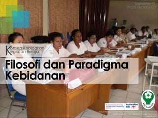 Dokumen ini membahas filosofi dan paradigma kebidanan. Filosofi kebidanan mencakup 4 aspek yaitu kehamilan, persalinan dan nifas sebagai peristiwa alamiah, peran bidan adalah memberikan asuhan kehamilan, persalinan dan nifas yang normal, pendekatan patient centered, dan kontinuitas pelayanan. Paradigma kebidanan meliputi pandangan terhadap manusia, lingkungan, perilaku dan sistem pelayanan kesehatan. Ada 3 tingkatan pelayanan ke