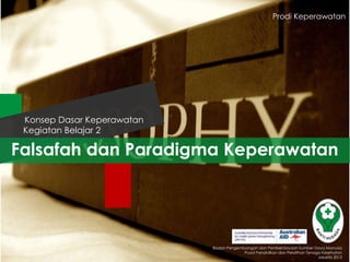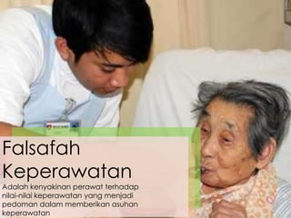 Dokumen tersebut membahas konsep dasar keperawatan yang mencakup falsafah dan paradigma keperawatan. Falsafah keperawatan dijelaskan sebagai keyakinan perawat dalam memberikan perawatan berdasarkan nilai-nilai keperawatan, sedangkan paradigma keperawatan didefinisikan sebagai pandangan global yang dianut oleh komunitas keperawatan dalam menghubungkan berbagai teori dan membangun kerangka kerja keperawatan. Dokumen ini juga menjel