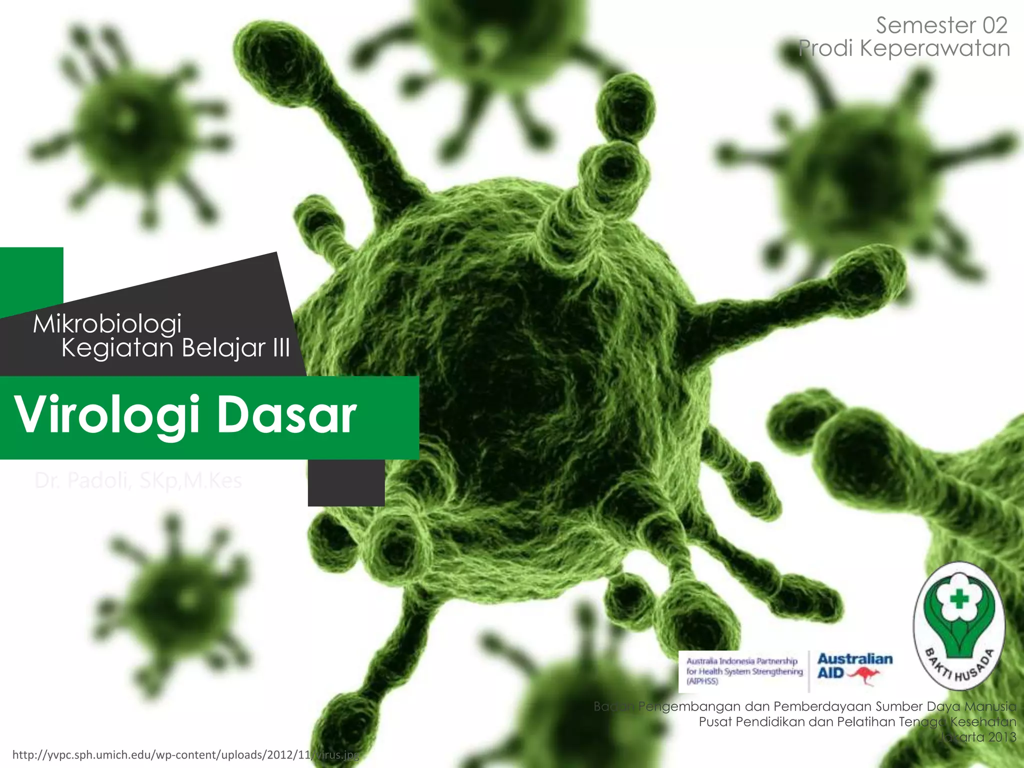 Teks tersebut merangkum tentang virologi dasar yang mencakup pengertian virus, struktur virus, morfologi virus, taksonomi virus, reproduksi virus, dan infeksi virus pada manusia. Secara singkat, virus adalah parasit berukuran mikroskopik yang menginfeksi sel organisme dan membutuhkan sel inang untuk berkembangbiak.