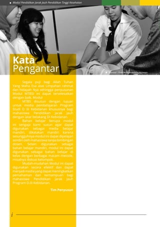 Modul pendidikan jarak jauh ini ditujukan untuk mahasiswa D3 kebidanan, khususnya tentang manajemen terpadu balita sakit (MTBS) yang mencakup penilaian dan klasifikasi penyakit pada anak usia 2 bulan sampai 5 tahun. MTBS bertujuan untuk meningkatkan kualitas pelayanan kesehatan dan menurunkan angka kematian balita melalui pendekatan integratif yang mencakup upaya kuratif, promotif, dan preventif. Modul ini juga menyediakan langkah-langkah belajar mandiri dan metode diskusi untuk memudahkan pemahaman materi.