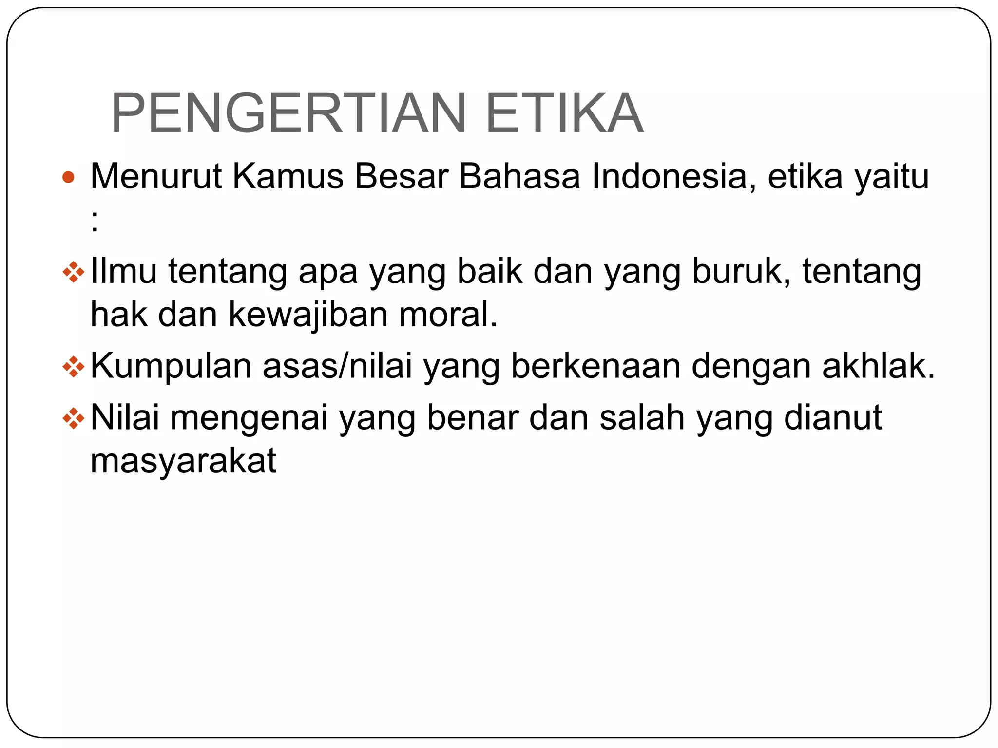 Dokumen ini menjelaskan pengertian etika dan moral, menyebutkan bahwa etika adalah ilmu tentang apa yang baik dan buruk, serta bagaimana cara seharusnya manusia hidup. Selain itu, faktor-faktor yang mempengaruhi pelanggaran etika dan konsekuensi sanksi pelanggaran etika juga dibahas. Dampak teknologi terhadap etika dan interaksi manusia juga menjadi perhatian, terutama dalam perubahan cara komunikasi dan hilangnya beberapa aspek kemanusiaan.
