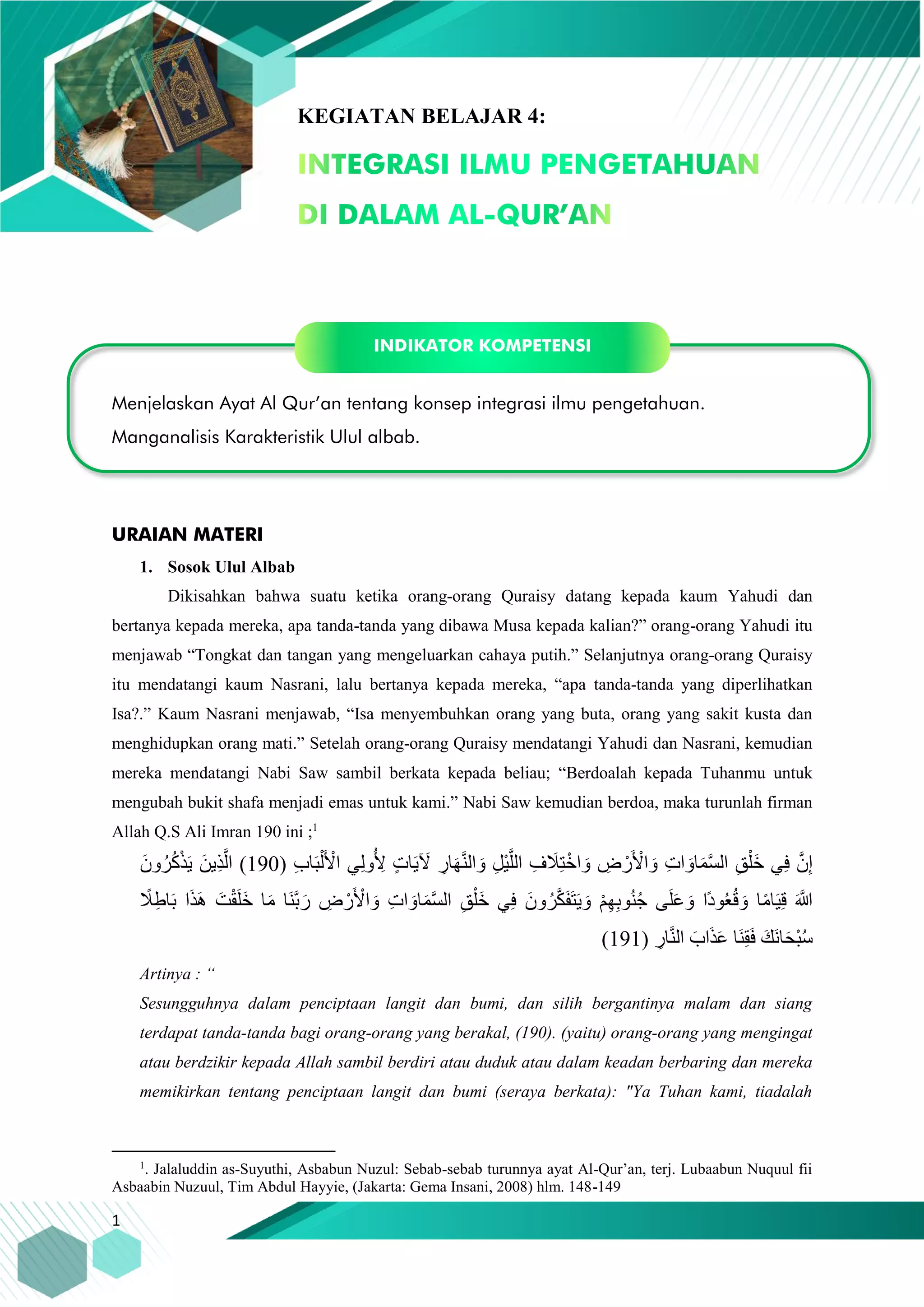 Dokumen ini membahas konsep integrasi ilmu pengetahuan melalui pandangan al-Qur'an, terutama dalam Surah Ali Imran ayat 190-191 yang menggambarkan pentingnya berdzikir dan bertafakkur bagi ulul albab, orang-orang yang berpikir kritis dan memahami penciptaan Allah. Ulul albab digambarkan sebagai individu yang memiliki wawasan luas, mengingat Allah dalam setiap keadaan, dan melakukan kajian untuk memahami keagungan ciptaan-Nya. Selain itu, dokumen ini menekankan bahwa ilmu pengetahuan yang dimiliki tidak terbatas oleh batasan manusia, melainkan merupakan bagian dari pengetahuan Allah yang lebih besar.