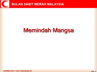 Dokumen ini memberikan panduan tentang cara-cara yang tepat untuk memindahkan mangsa kemalangan. Ia menjelaskan bahawa keputusan untuk memindahkan mangsa bergantung pada keadaan mangsa dan lokasi kemalangan, serta menekankan pentingnya pemeriksaan sebelum pemindahan. Dokumen ini juga menerangkan beberapa teknik pemindahan mangsa secara berseorangan, berdua, bertiga atau berempat mengikut keadaan kecederaan mang