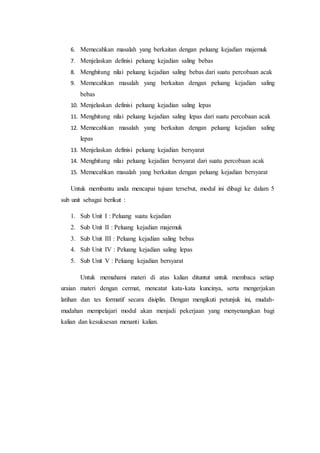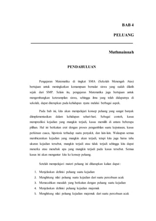 Bab ini membahas konsep peluang yang relevan dalam kehidupan sehari-hari seperti memprediksi kejadian, memilih di antara pilihan, dan pengambilan keputusan. Konsep peluang akan dijelaskan melalui sub-unit tentang peluang suatu kejadian, peluang kejadian majemuk, peluang kejadian saling bebas, peluang kejadian saling lepas, dan peluang kejadian bersyarat.