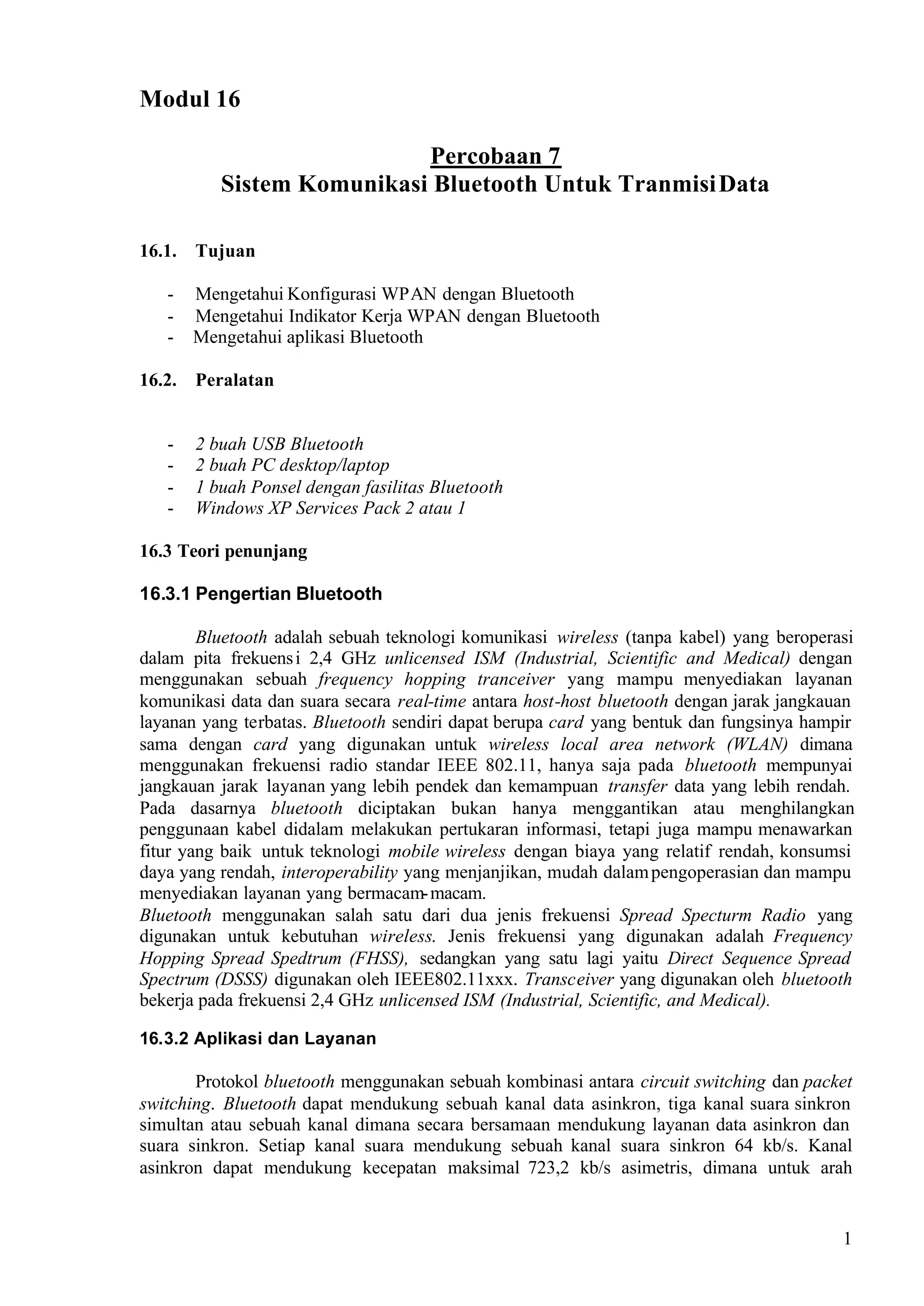 Modul 16 membahas percobaan sistem komunikasi Bluetooth untuk transmisi data, meliputi tujuan percobaan mengenali konfigurasi dan indikator WPAN Bluetooth serta aplikasinya, peralatan yang diperlukan, teori penunjang seperti pengertian Bluetooth dan aplikasi/layanannya, langkah-langkah percobaan seperti instalasi awal, transfer data, dan PAN, serta pengukuran pengaruh jarak terhadap koneksi Bluetooth."