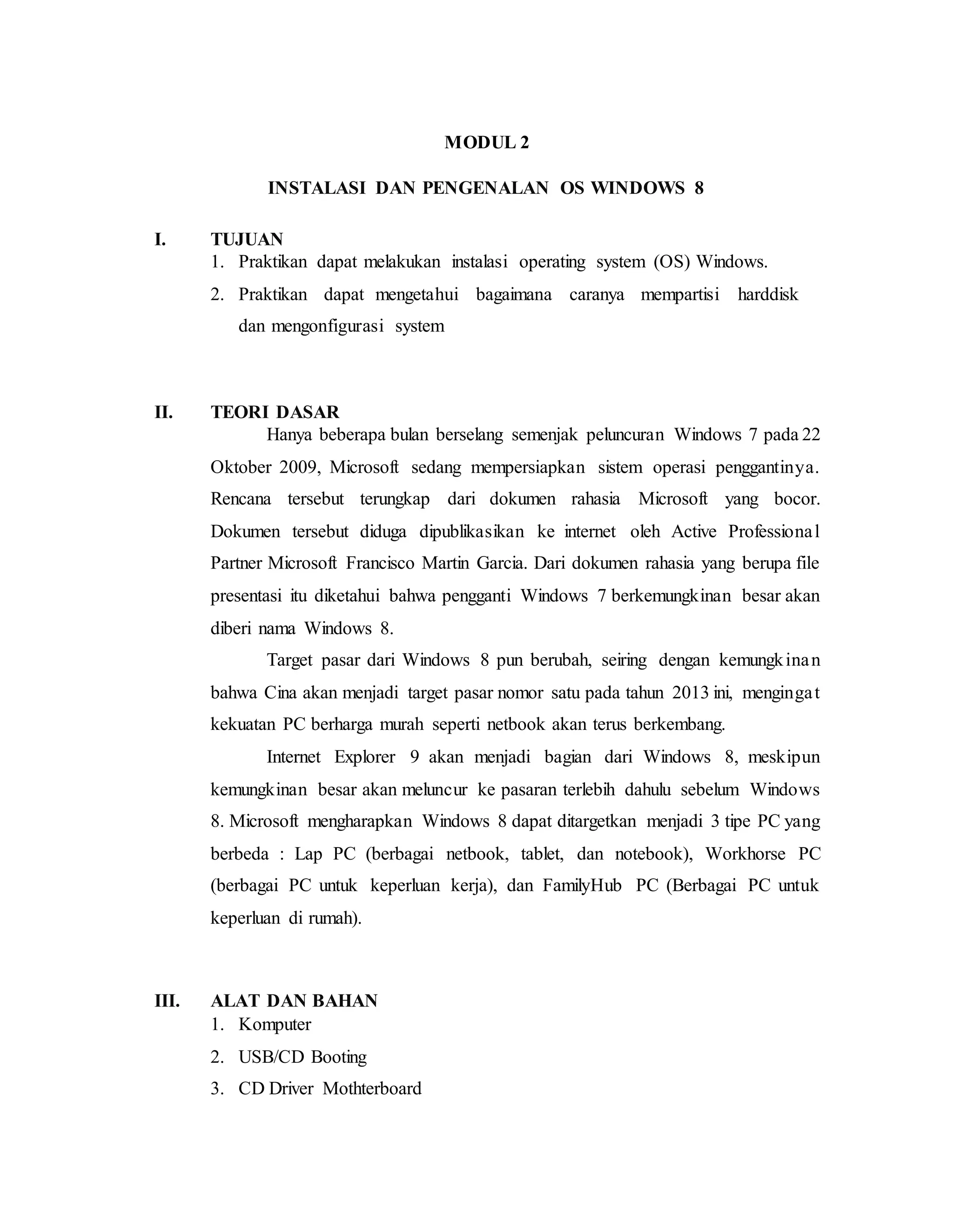 Dokumen ini adalah modul tentang instalasi dan pengenalan sistem operasi Windows 8, yang mencakup tujuan, teori dasar, alat dan bahan, serta langkah-langkah prosedur instalasi. Windows 8 dirancang untuk berbagai perangkat dan memperkenalkan fitur baru seperti Windows Store dan antarmuka sentuh. Proses instalasi melibatkan persiapan, pemilihan partisi, dan konfigurasi sistem untuk memenuhi kebutuhan pengguna.