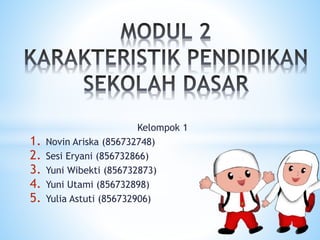 Dokumen ini membahas tujuan, karakteristik, dan tatanan organisasi pendidikan sekolah dasar (SD), meliputi kemelekwancanaan, kemampuan berkomunikasi, dan problem solving. Tanggung jawab penyelenggaraan SD melibatkan pemerintah pusat dan daerah, dengan pengelolaan berbasis sekolah. Berbagai bentuk penyelenggaraan SD dijelaskan, termasuk SD reguler, madrasah, dan pendidikan inklusi.