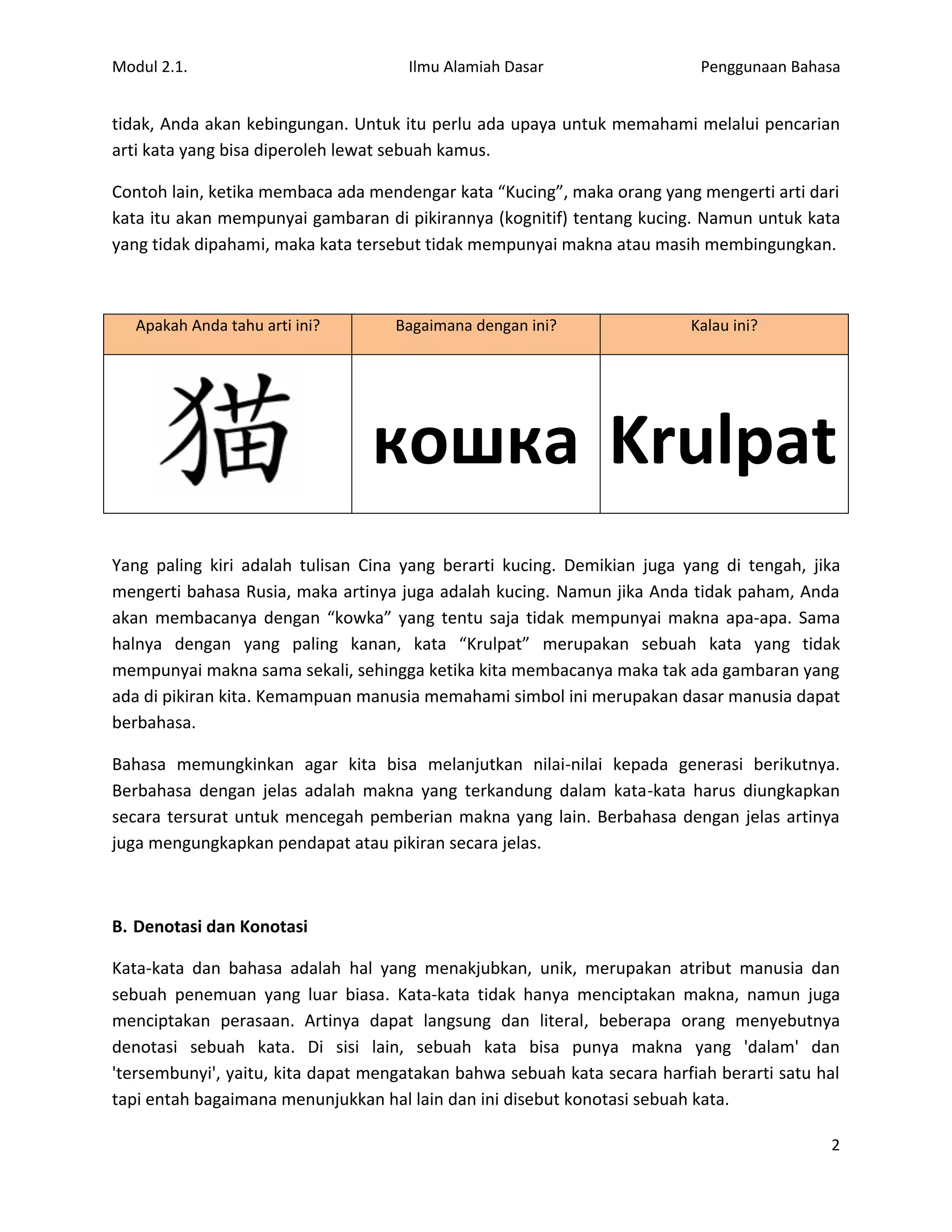 Modul ini membahas penggunaan bahasa dalam logika, termasuk tiga fungsi bahasa utama (informasi, ekspresif, dan direktif), perbedaan denotasi dan konotasi, hubungan antara bahasa dan logika, serta pentingnya memahami makna kata secara tepat dalam berargumentasi.