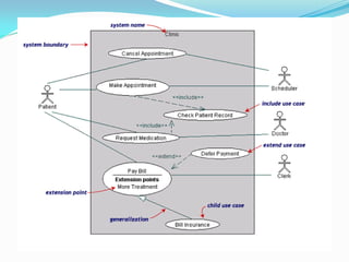 UML digunakan untuk merancang sistem dengan menggunakan diagram seperti use case diagram, activity diagram, dan class diagram. Use case diagram menggambarkan fungsi sistem dari sudut pandang pengguna, activity diagram menggambarkan aliran proses bisnis, dan class diagram menggambarkan struktur dan hubungan antar kelas dalam sistem.