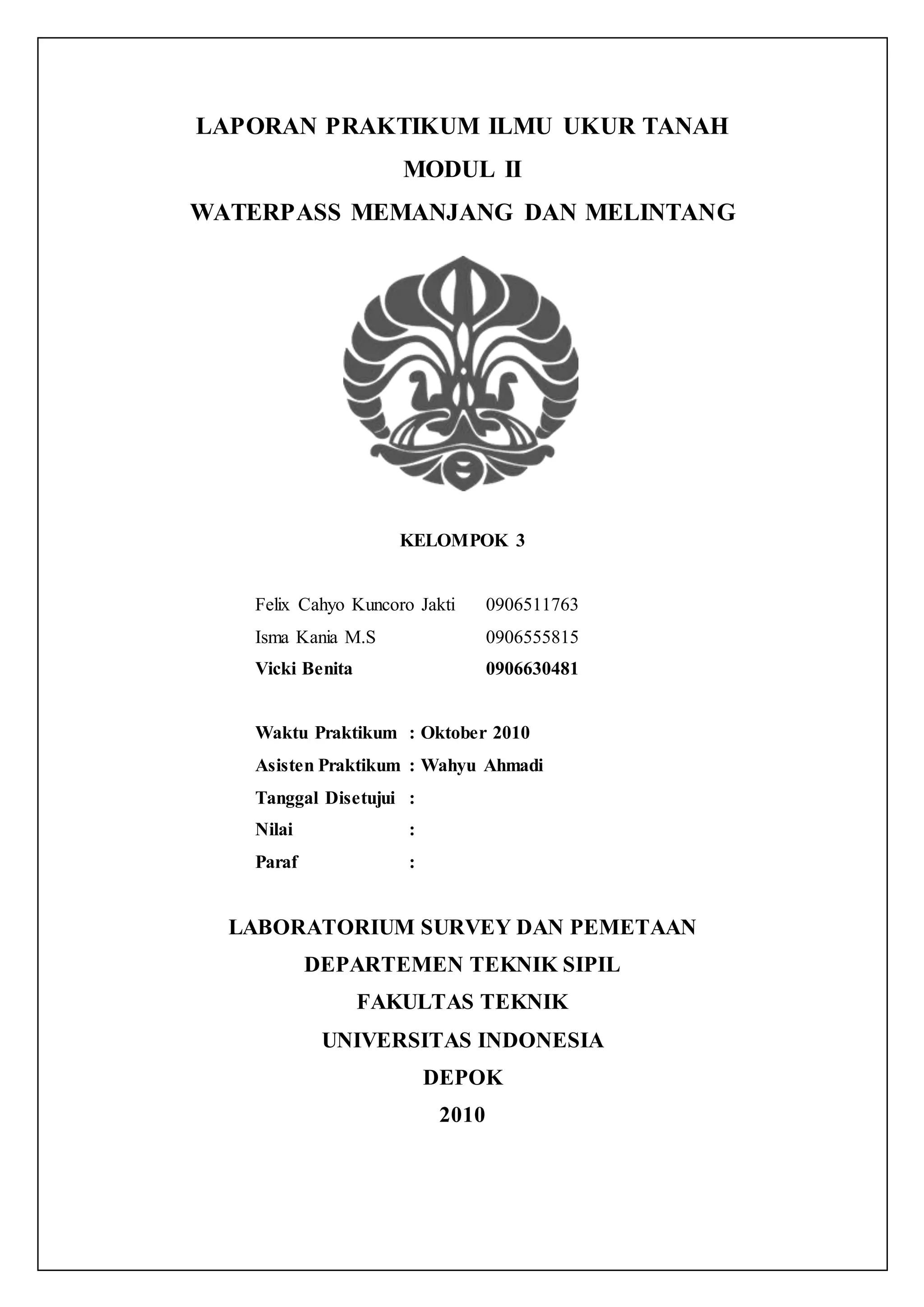 Laporan ini membahas praktikum pengukuran ketinggian menggunakan alat waterpass oleh Kelompok 3 di Departemen Teknik Sipil Universitas Indonesia. Tujuan praktikum adalah untuk mendapatkan data ketinggian titik-titik yang diukur dan memahami prinsip dasar pengukuran beda tinggi. Hasil praktikum menunjukkan adanya metode pengukuran yang digunakan, pengolahan data, dan analisis kesalahan relatif pada setiap titik pengukuran.