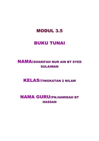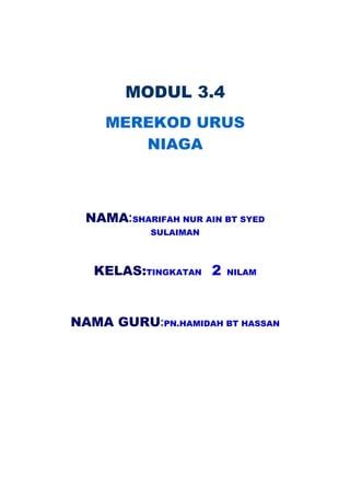 This document contains student information for Sharifah Nur Ain bt Syed Sulaiman who is in Tingkatan 2 Nilam class. It lists her name, class, and teacher Pn. Hamidah bt Hassan for modules 3.4 on business transaction coding and 3.5 on cash books.
