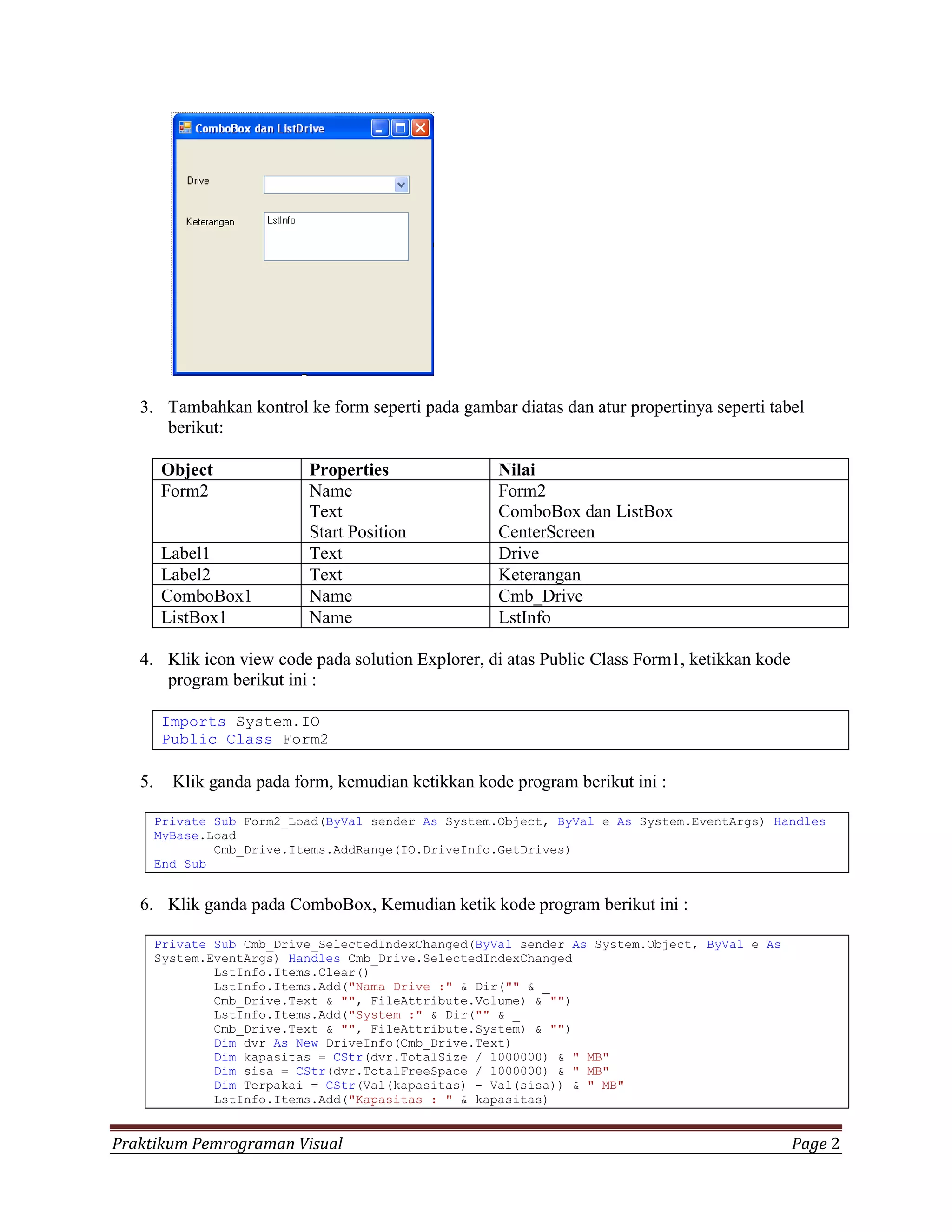 Dokumen tersebut memberikan penjelasan tentang praktikum pemrograman visual mengenai form dan objek kontrol pada Visual Basic 2008. Praktikum ini meliputi penggunaan combo box, list box, timer, date time picker, menu strip, context menu strip, dan rich text box.