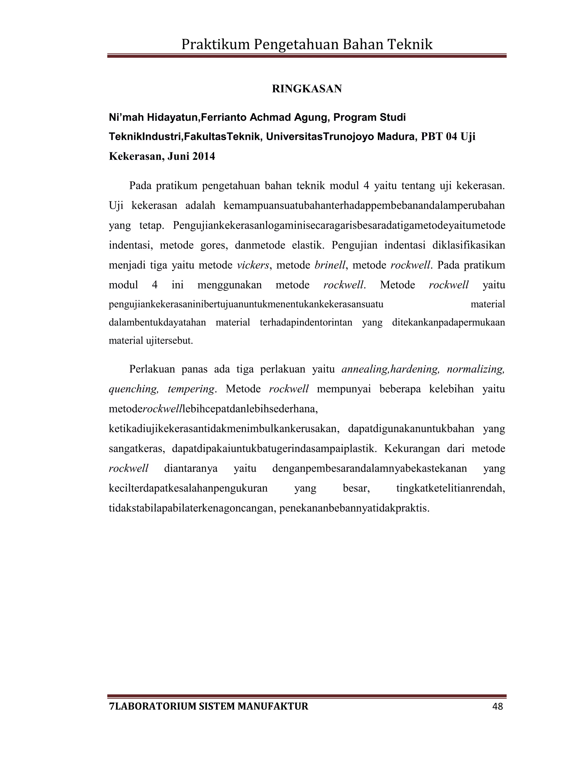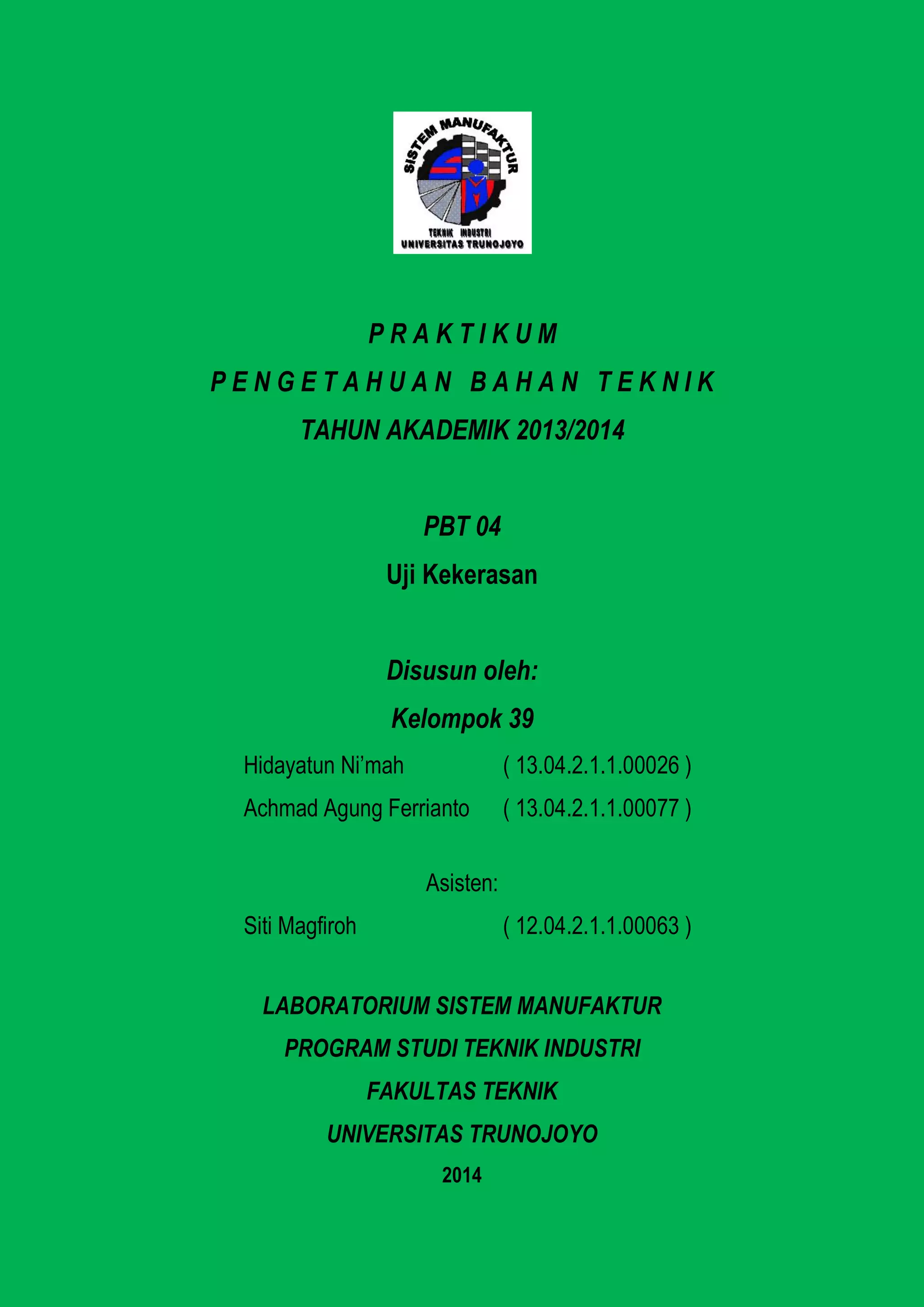 Dokumen ini menjelaskan praktikum pengujian kekerasan bahan teknik, terutama menggunakan metode Rockwell untuk menentukan kekerasan baja ST-60. Metode ini memiliki kelebihan seperti proses yang cepat dan tidak merusak, tetapi juga beberapa kekurangan seperti ketelitian yang rendah dan kesulitan dalam mengukur bahan yang tidak homogen. Tujuan praktikum adalah agar mahasiswa dapat memahami dan melakukan pengujian kekerasan serta efek perlakuan panas terhadap kekerasan material.