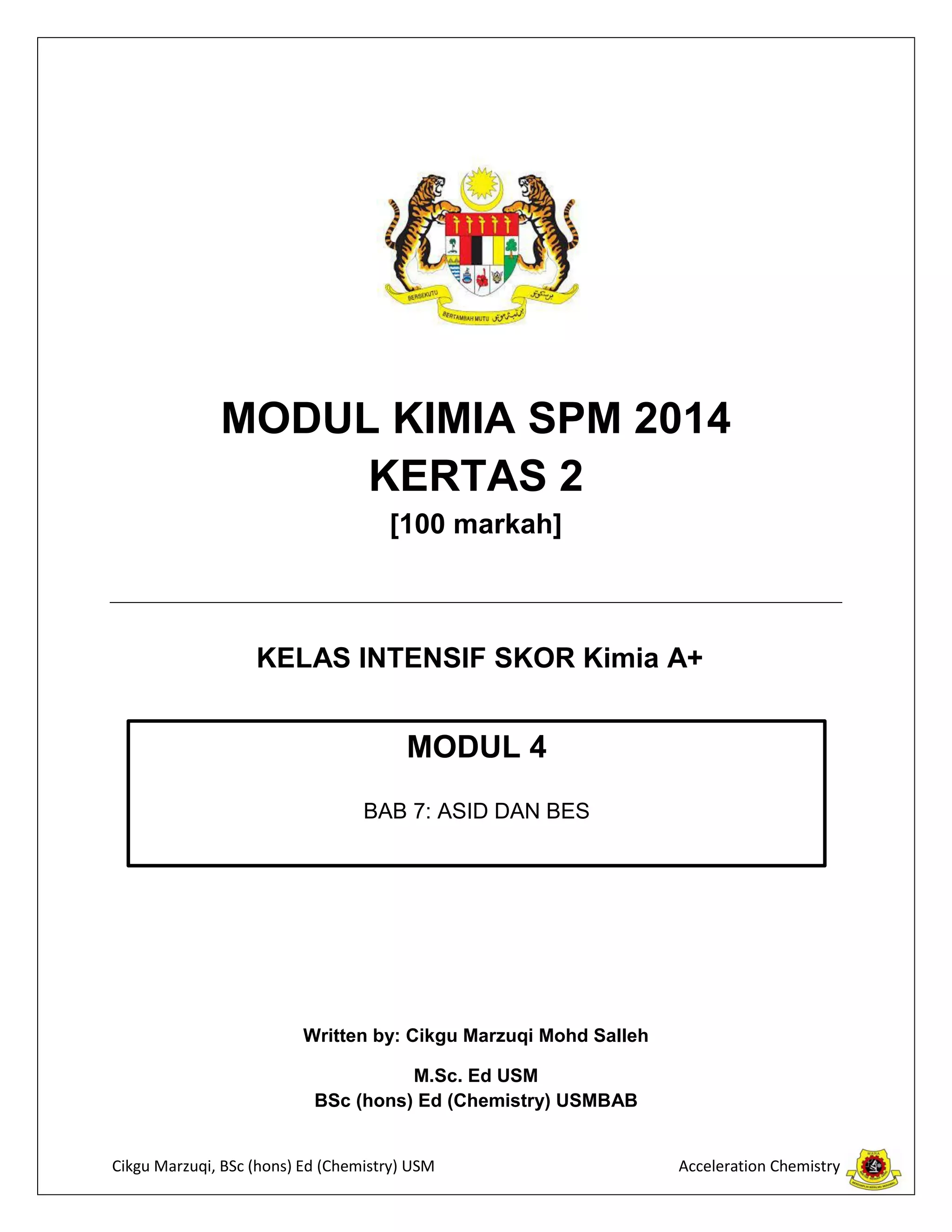 Dokumen ini adalah modul kimia SPM 2014 yang membahas tentang asid dan bes, termasuk definisi, sifat, dan kegunaan asid dan bes, serta konsep kekuatan asid dan alkali. Ia juga menerangkan tentang kepekatan larutan, proses peneutralan, dan eksperimen berkaitan. Pelbagai contoh dan penerangan ditawarkan untuk pemahaman lebih mendalam tentang subjek ini.