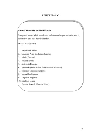 Dokumen tersebut membahas tentang kegiatan belajar yang mencakup pengertian, landasan, asas, tujuan, prinsip, fungsi, jenis, peranan, dan organisasi koperasi. Topik-topik tersebut dijelaskan secara rinci untuk membantu peserta memahami konsep dasar tentang koperasi."