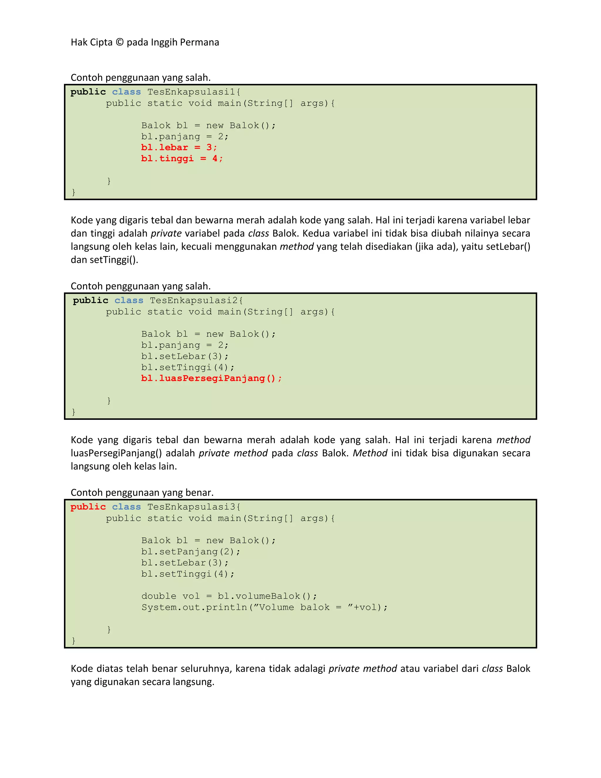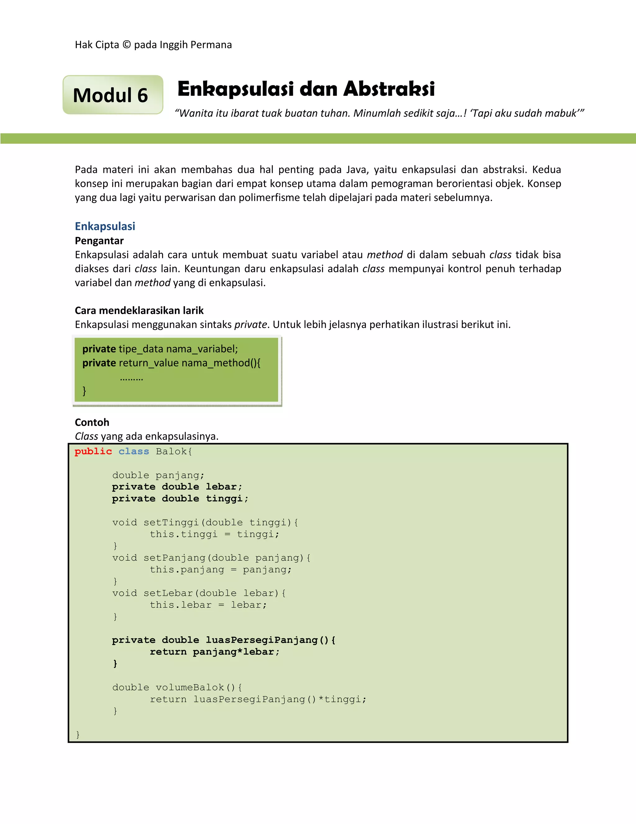 Modul ini membahas dua konsep penting dalam pemograman berorientasi objek yaitu enkapsulasi dan abstraksi. Enkapsulasi digunakan untuk membatasi akses terhadap variabel dan method dalam suatu class. Abstraksi diterapkan pada class dan method, di mana class abstrak tidak dapat diinstansiasi langsung melainkan menjadi class parent, sedangkan method abstrak hanya berisi deklarasi tanpa implementasi.