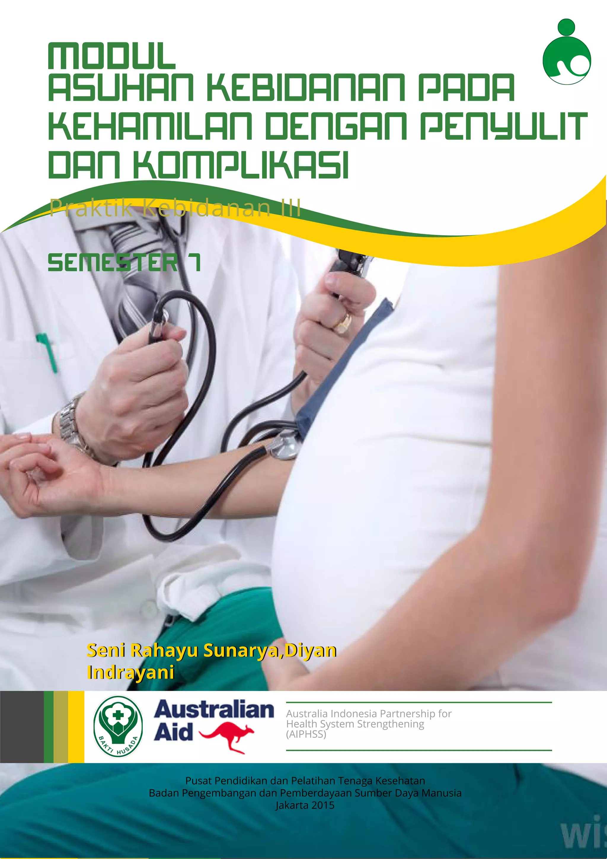 Modul ini membahas asuhan kebidanan pada kehamilan dengan penyulit dan komplikasi. Modul dibagi menjadi 6 kegiatan belajar yang mencakup asuhan pada ibu dengan perdarahan hamil muda, ibu hamil anemia, preeklamsi, perdarahan hamil lanjut, infeksi malaria, dan HIV/AIDS. Tujuannya agar mahasiswa dapat memberikan asuhan berupa deteksi dini, penatalaksanaan awal, kolaborasi, dan rujukan pada i