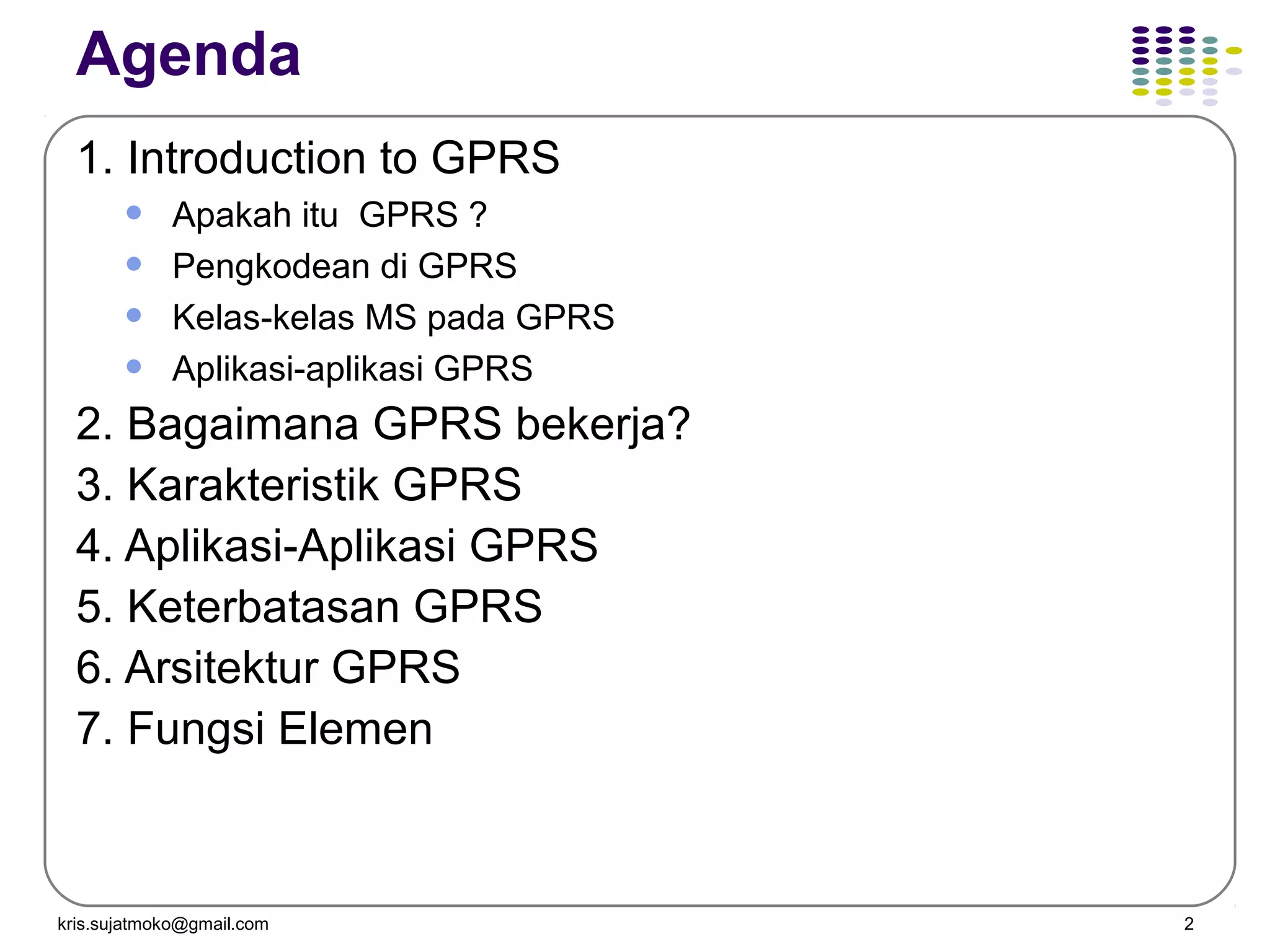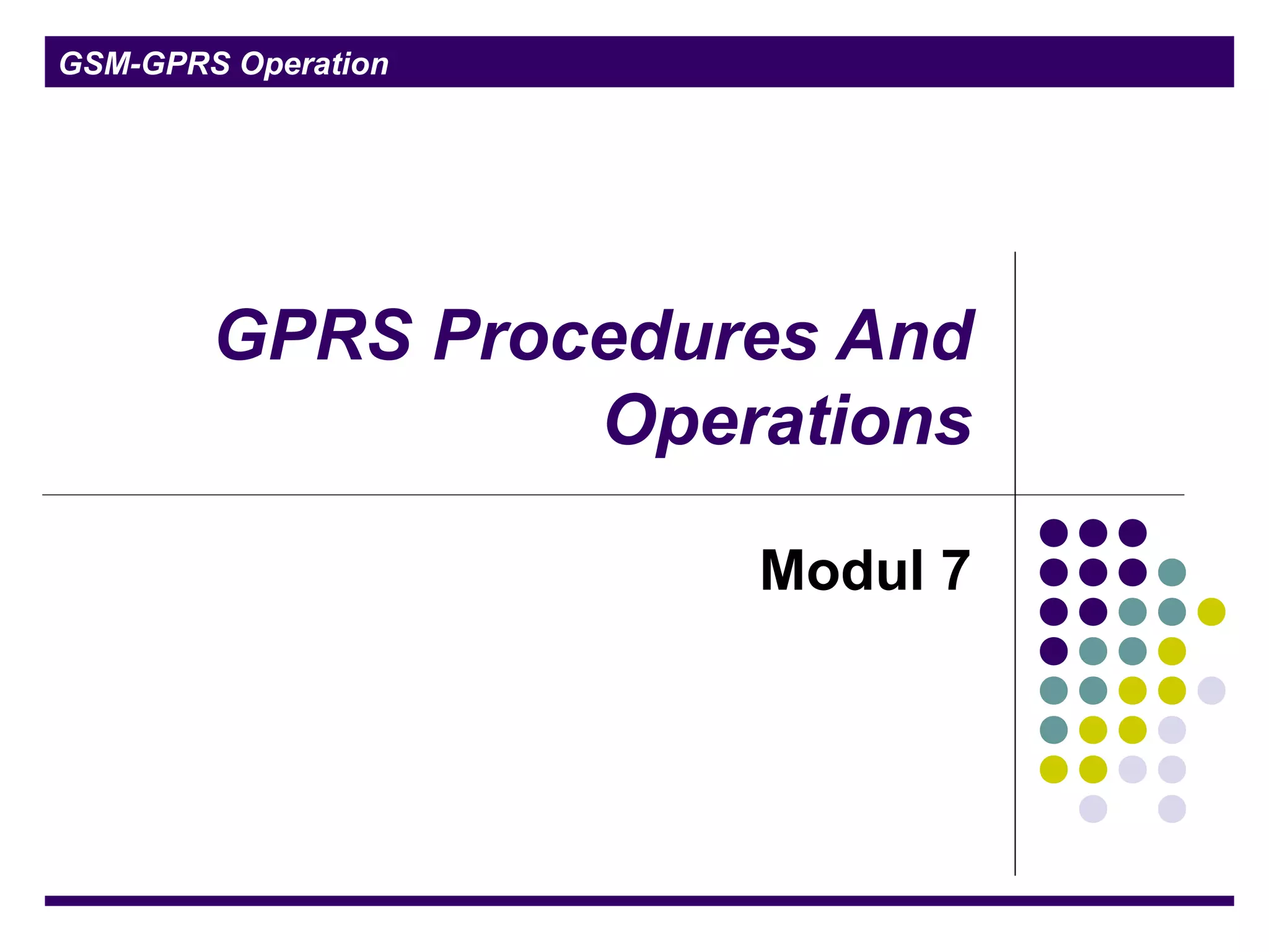 The document discusses GPRS operations and procedures. It provides an overview of GPRS architecture, protocols used in GPRS, mobility management procedures like GPRS attach and routing area update, and location management in GPRS. Diagrams are included to illustrate logical architecture, data transfer between network elements, and mobility states of a GPRS mobile station.