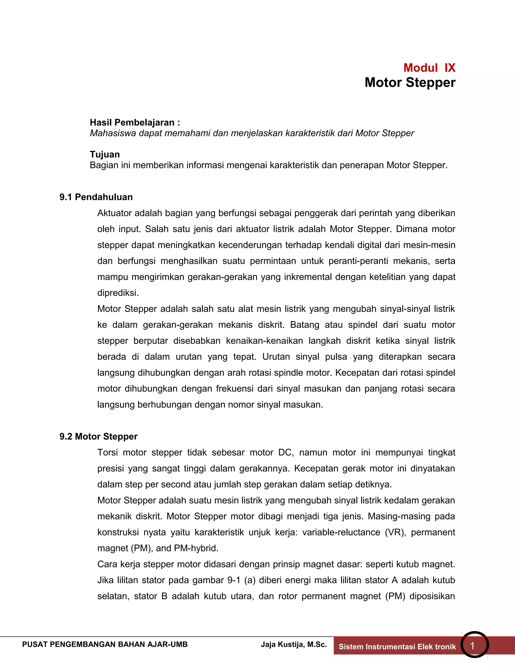 Dokumen ini menjelaskan karakteristik dan penerapan motor stepper, yang merupakan jenis aktuator listrik dengan kemampuan mengubah sinyal listrik menjadi gerakan mekanis diskrit. Terdapat tiga jenis motor stepper yaitu variable-reluctance (vr), permanent magnet (pm), dan pm-hybrid, dengan masing-masing memiliki kelebihan dalam presisi, torsi, dan aplikasi. Motor stepper sering digunakan dalam berbagai industri berkat kemampuannya untuk memberikan kendali digital yang akurat.
