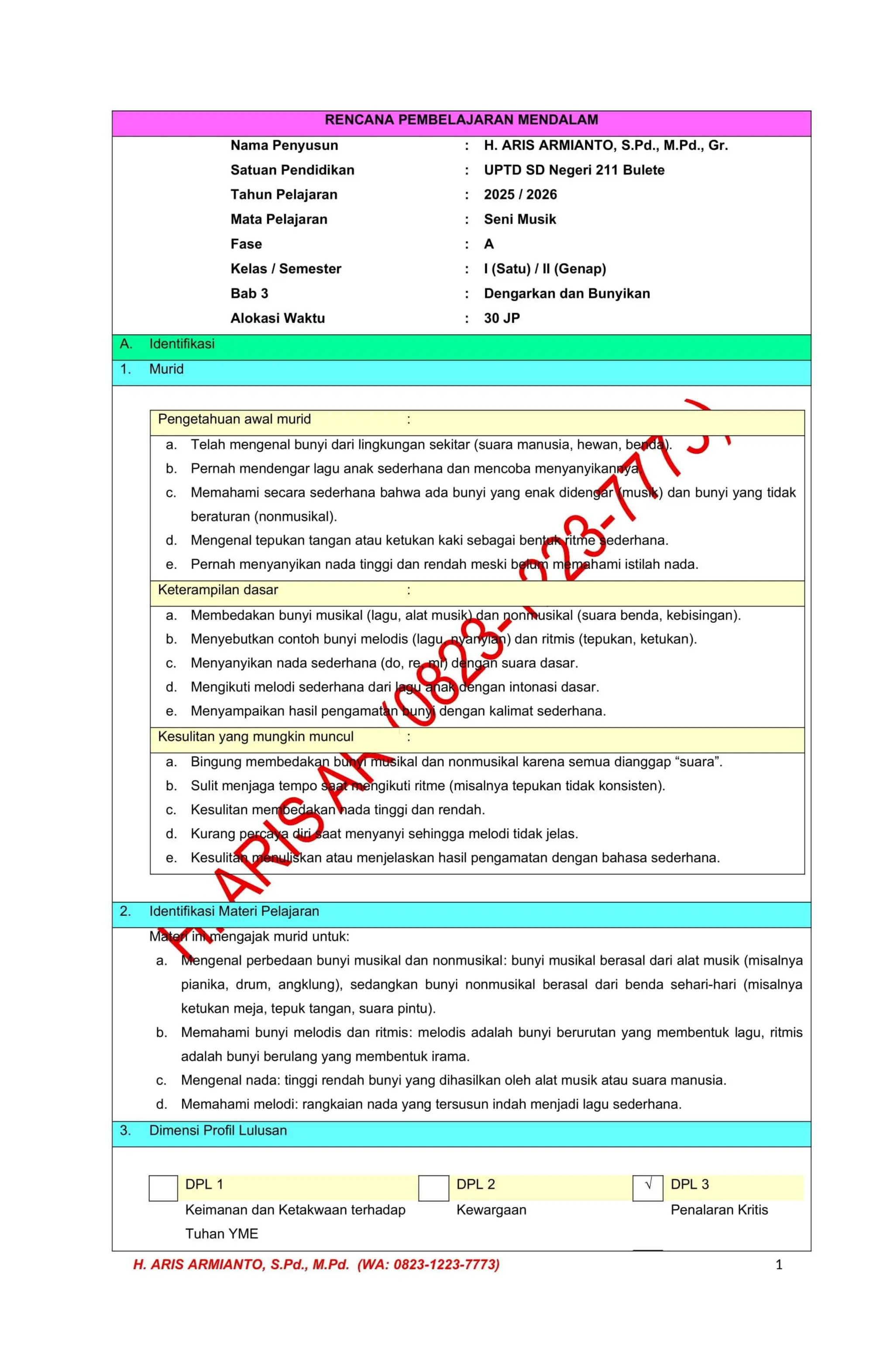 MODUL AJAR DEEP LEARNING SENI MUSIK KELAS 1 (RENCANA PEMBELAJARAN MENDALAM) CP 046 REVISI 2025 RENCANA PEMBELAJARAN MENDALAM (RPM) SENI MUSIK KELAS 1 CP 046 REVISI 2025 MODUL PEMBELAJARAN MENDALAM SENI MUSIK KELAS 1 CP 046 REVISI 2025 Capaian Pembelajaran 046/H/KR/2025 Mengalami : Mengenali unsur-unsur musik (nada dan irama) menggunakan anggota tubuh maupun alat musik. Merefleksikan : Melakukan umpan balik mengenai praktik bermain musik diri sendiri atau orang lain menggunakan bahasa sehari-hari. Berpikir dan Bekerja Artistik : Menirukan pola irama dan nada menggunakan alat musik ritmis atau melodis; mengenali ragam alat musik dan bunyi yang dihasilkan; mengenali cara memainkan dan membersihkan instrumen/alat musik. Menciptakan : Membuat pola irama menggunakan anggota tubuh atau alat musik ritmis yang tersedia di lingkungan sekitar. Berdampak : Menunjukkan ekspresi senang dalam kegiatan bermusik. Tujuan Pembelajaran: 3.1 Murid mampu memahami ragam bunyi nonmusikal dan nonmelodis yang ada di lingkungan sekitar. 3.2 Murid mampu mengaplikasikan keterampilan mendengarkan, mengidentifikasi, dan menirukan bunyi dengan media sederhana. 3.3 Murid mampu memahami perbedaan alat musik ritmis dan melodis di nusantara. 3.4 Murid mampu mengaplikasikan …. 3.5 Murid mampu memahami …. 3.6 Murid mampu mengaplikasikan …. 3.7 Murid mampu memahami …. 3.8 Murid mampu mengaplikasikan ….