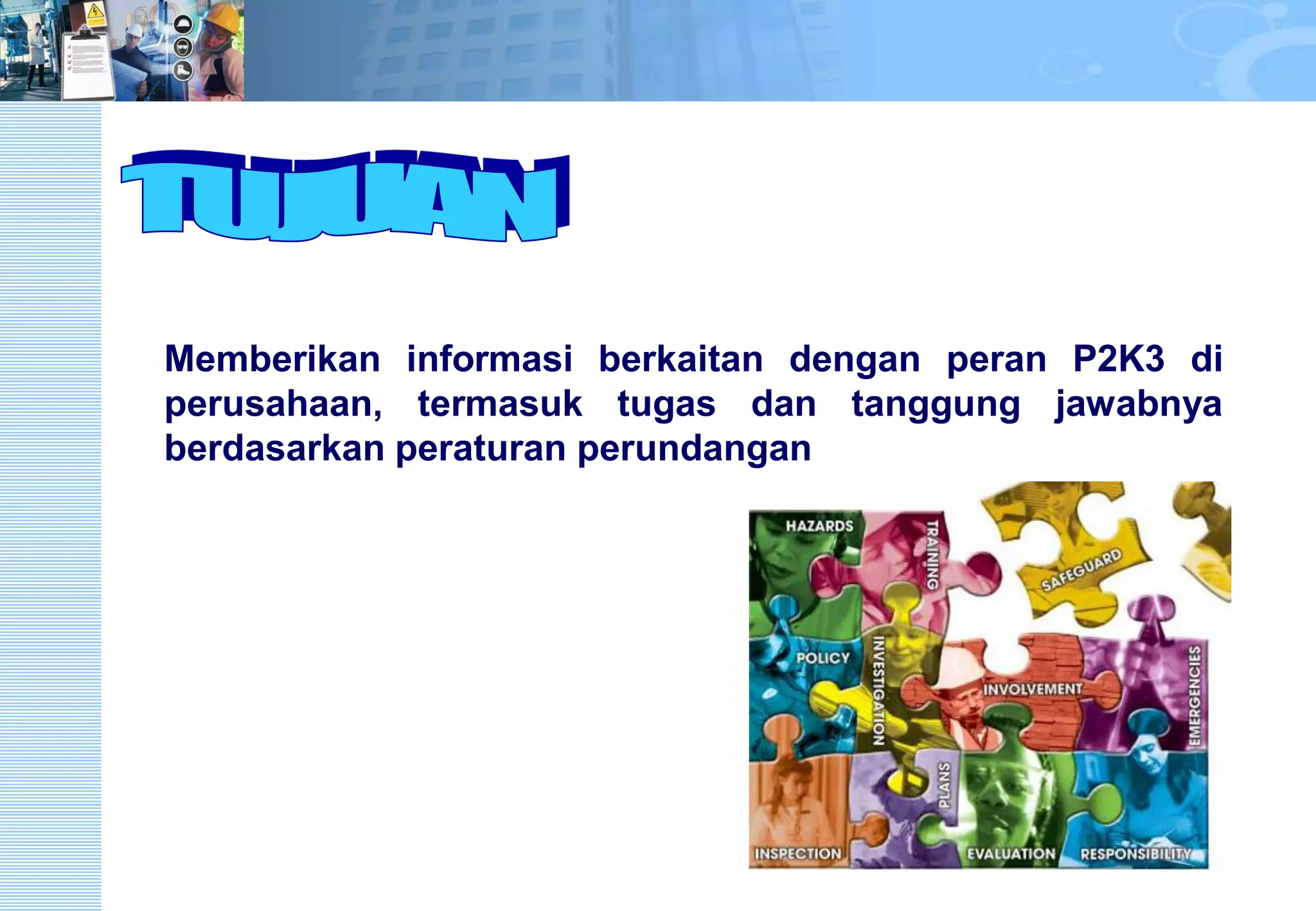 Dokumen ini menjelaskan peran dan tanggung jawab P2K3 (Panitia Pengawas K3) di perusahaan, termasuk dasar hukum, struktur organisasi, dan tugas-tugasnya dalam meningkatkan keselamatan dan kesehatan kerja. P2K3 bertugas membantu perusahaan dalam penerapan K3, identifikasi bahaya, dan pengendalian risiko di lingkungan kerja. Selain itu, P2K3 juga berperan dalam sosialisasi dan promosi K3 kepada seluruh karyawan.
