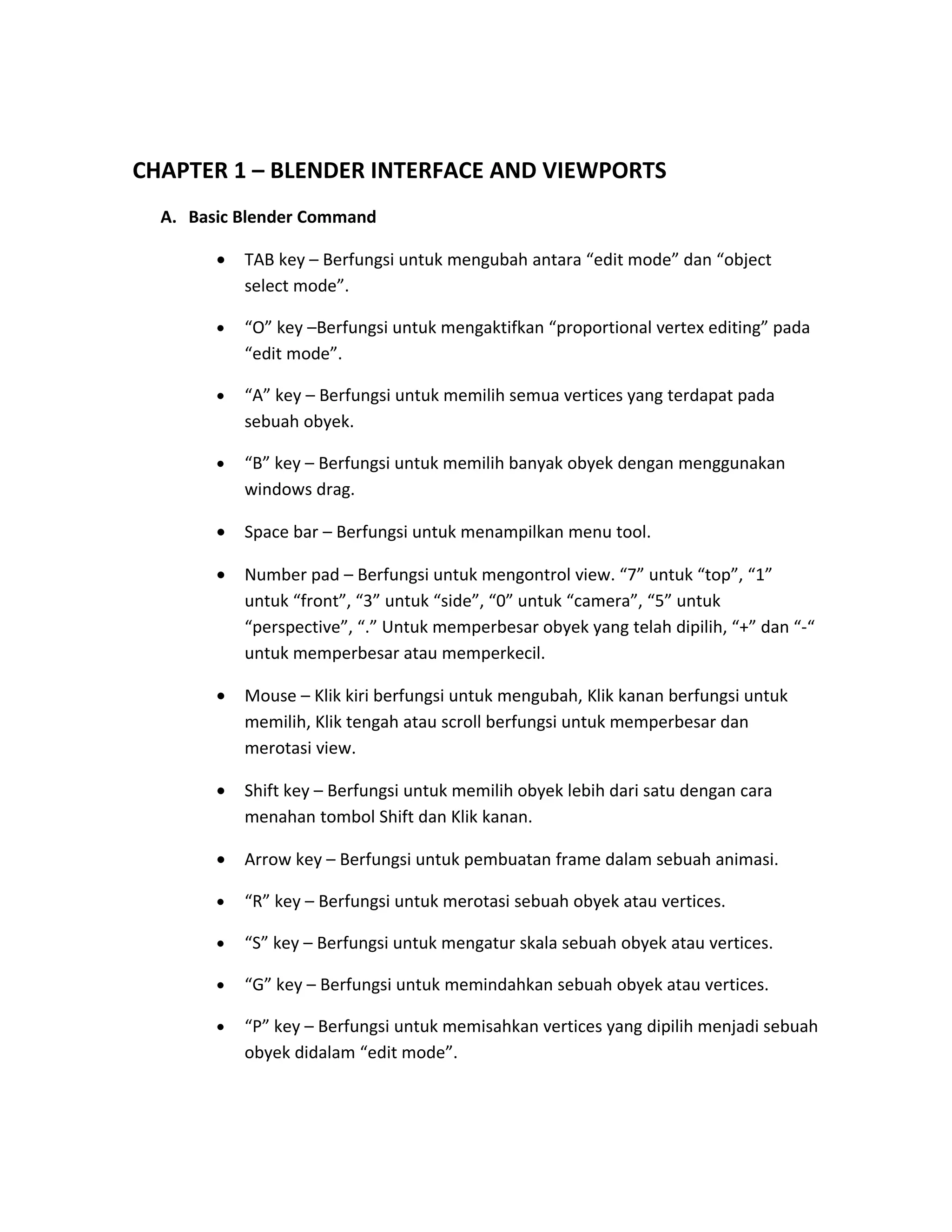 Dokumen ini menjelaskan berbagai fitur dan perintah dasar dalam Blender, termasuk cara berinteraksi dengan antarmuka, mengedit objek, dan menggunakan pencahayaan serta kamera. Selain itu, juga terdapat penjelasan tentang pembuatan dan pengeditan teks 3D, serta dasar-dasar animasi dalam Blender. Informasi ini ditujukan untuk membantu pengguna baru memahami cara membuat, mengedit, dan mengatur objek 3D dengan efisien.
