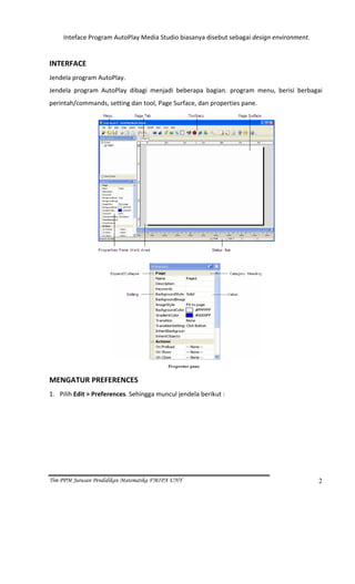 Dokumen ini adalah modul pelatihan untuk perangkat lunak Autoplay Media Studio, yang digunakan untuk membuat presentasi multimedia dengan berbagai tipe media. Tutorial tersebut mencakup langkah-langkah mulai dari memulai proyek baru, mengatur elemen desain, menambahkan objek, hingga menambahkan interaksi dan navigasi dalam presentasi. Modul ini juga memberikan panduan praktis dalam memodifikasi objek dan menambahkan aksi sederhana dengan skrip.