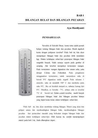 Dokumen ini membahas bilangan bulat dan bilangan pecahan, serta penerapannya dalam kehidupan sehari-hari. Pada bab ini, ada penjelasan mengenai pengertian, jenis-jenis, dan cara membandingkan bilangan bulat dan pecahan. Pembaca diharapkan dapat memahami dan menguasai materi melalui latihan dan tes formatif yang disediakan.