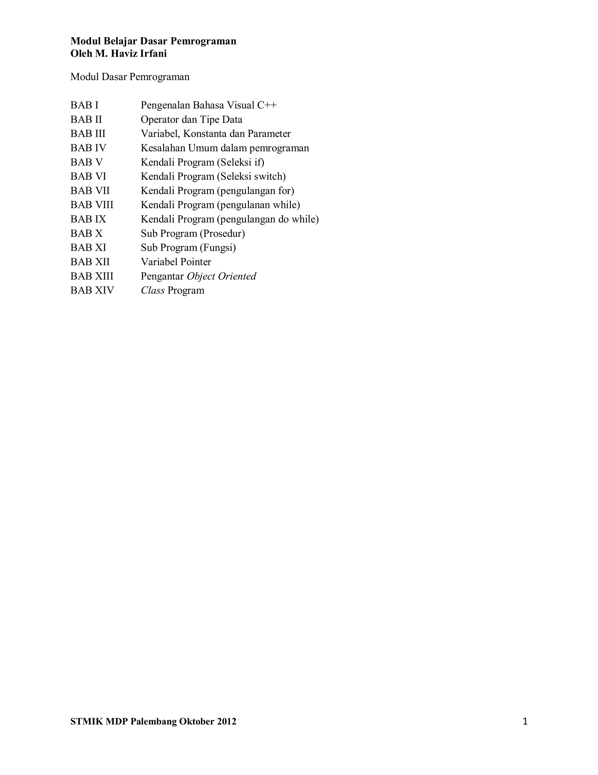 Dokumen ini adalah modul pembelajaran dasar pemrograman menggunakan Visual C++ yang mencakup berbagai konsep seperti pengenalan bahasa, tipe data, variabel, operator, dan struktur kontrol pemrograman. Selain itu, modul ini juga membahas kesalahan umum dalam pemrograman dan langkah-langkah dalam pembuatan program. Terdapat penjelasan mendetail tentang operator aritmatika, tipe data, dan struktur program dalam C++.
