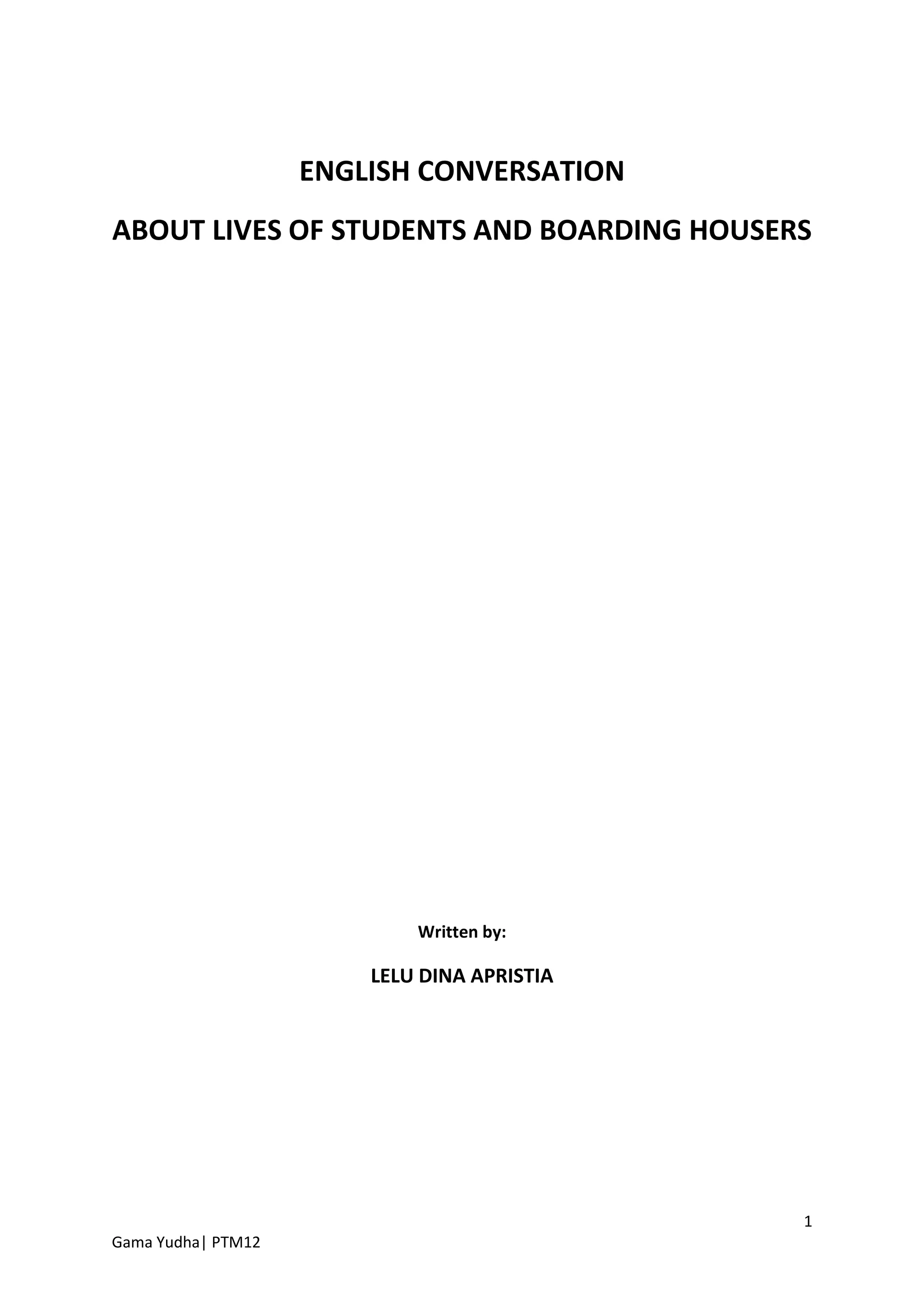 The document discusses an English conversation primer focused on the lives of students and boarding house residents. It includes introductory remarks and a table of contents outlining various conversational topics like waking up, being late for class, eating meals, doing chores, and social activities. The goal is to provide applicable English conversations on typical daily experiences.